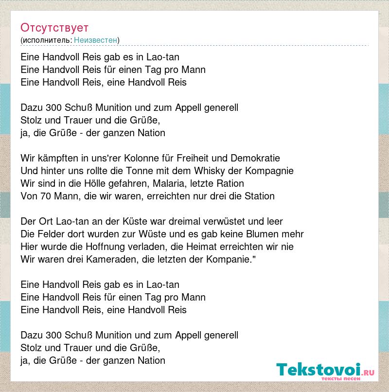 Eine Handvoll Reis gab es in Lao-tan Eine Handvoll Reis für einen Tag pro Mann Eine Handvoll Reis, eine Handvoll Reis Dazu 300 Schuß Munition und zum Appell generell Stolz und Trauer und die Grüße, ja, die Grüße - der ganzen Nation Wir kämpften in uns'rer Kolonne für Freiheit und Demokratie Und hinter uns rollte die Tonne mit dem Whisky der Kompagnie Wir sind in die Hölle gefahren, Malaria, letzte Ration Von 70 Mann, die wir waren, erreichten nur drei die Station Der Ort Lao-tan an der Küste war dreimal verwüstet und leer Die Felder dort wurden zur Wüste und es gab keine Blumen mehr Hier wurde die Hoffnung verladen, die Heimat erreichten wir nie Wir waren drei Kameraden, die letzten der Kompanie." Eine Handvoll Reis gab es in Lao-tan Eine Handvoll Reis für einen Tag pro Mann Eine Handvoll Reis, eine Handvoll Reis Dazu 300 Schuß Munition und zum Appell generell Stolz und Trauer und die Grüße, ja, die Grüße - der ganzen Nation