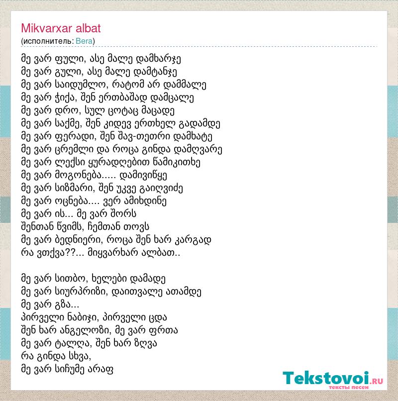მე ვარ ფული, ასე მალე დამხარჯე მე ვარ გული, ასე მალე დამტანჯე მე ვარ საიდუმლო, რატომ არ დამმალე მე ვარ ჭიქა, შენ ერთბაშად დამცალე მე ვარ დრო, სულ ცოტაც მაცადე მე ვარ საქმე, შენ კიდევ ერთხელ გადამდე მე ვარ ფერადი, შენ შავ-თეთრი დამხატე მე ვარ ცრემლი და როცა გინდა დამღვარე მე ვარ ლექსი ყურადღებით წამიკითხე მე ვარ მოგონება..... დამივიწყე მე ვარ სიზმარი, შენ უკვე გაიღვიძე მე ვარ ოცნება.... ვერ ამიხდინე მე ვარ ის... მე ვარ შორს შენთან წვიმს, ჩემთან თოვს მე ვარ ბედნიერი, როცა შენ ხარ კარგად რა ვთქვა??... მიყვარხარ ალბათ.. მე ვარ სითბო, ხელები დამადე მე ვარ სიურპრიზი, დაითვალე ათამდე მე ვარ გზა... პირველი ნაბიჯი, პირველი ცდა შენ ხარ ანგელოზი, მე ვარ ფრთა მე ვარ ტალღა, შენ ხარ ზღვა რა გინდა სხვა, მე ვარ სიჩუმე არაფ