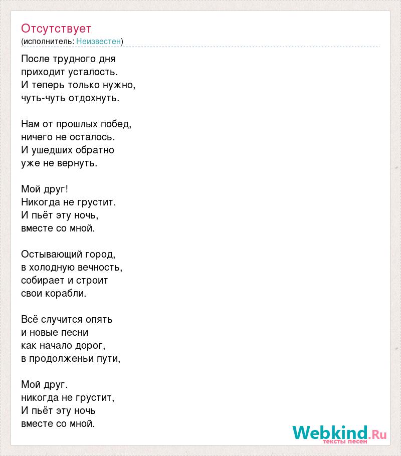После трудного дня приходит усталость. И теперь только нужно, чуть-чуть отдохнуть. Нам от прошлых побед, ничего не осталось. И ушедших обратно уже не вернуть. Мой друг! Никогда не грустит. И пьёт эту ночь, вместе со мной. Остывающий город, в холодную вечность, собирает и строит свои корабли. Всё случится опять и новые песни как начало дорог, в продолженьи пути, Мой друг. никогда не грустит, И пьёт эту ночь вместе со мной.