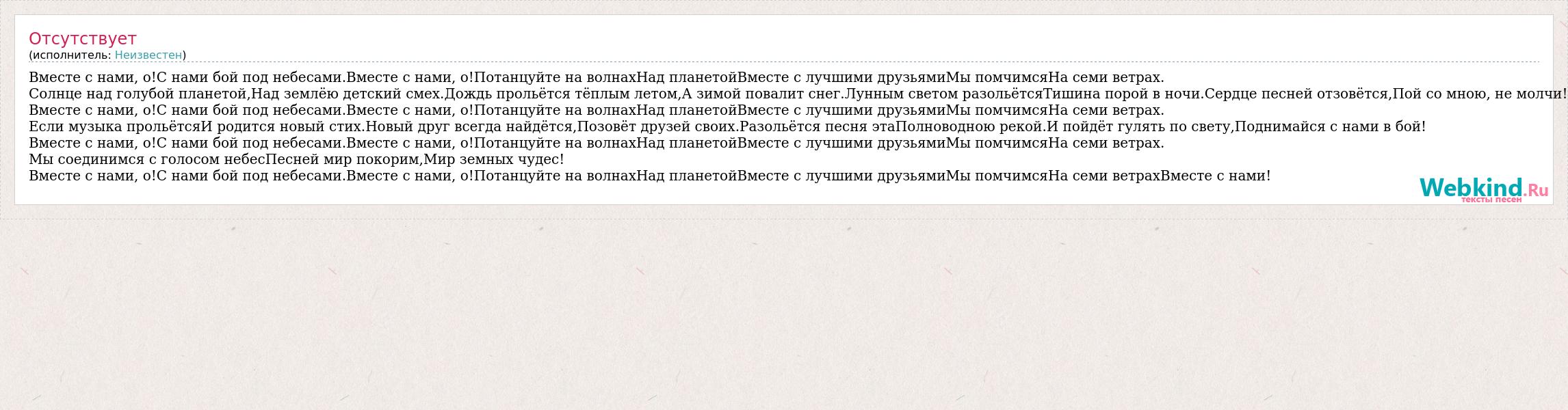 Вместе с нами, о!С нами бой под небесами.Вместе с нами, о!Потанцуйте на волнахНад планетойВместе с лучшими друзьямиМы помчимсяНа семи ветрах. Солнце над голубой планетой,Над землёю детский смех.Дождь прольётся тёплым летом,А зимой повалит снег.Лунным светом разольётсяТишина порой в ночи.Сердце песней отзовётся,Пой со мною, не молчи! Вместе с нами, о!С нами бой под небесами.Вместе с нами, о!Потанцуйте на волнахНад планетойВместе с лучшими друзьямиМы помчимсяНа семи ветрах. Если музыка прольётсяИ родится новый стих.Новый друг всегда найдётся,Позовёт друзей своих.Разольётся песня этаПолноводною рекой.И пойдёт гулять по свету,Поднимайся с нами в бой! Вместе с нами, о!С нами бой под небесами.Вместе с нами, о!Потанцуйте на волнахНад планетойВместе с лучшими друзьямиМы помчимсяНа семи ветрах. Мы соединимся с голосом небесПесней мир покорим,Мир земных чудес! Вместе с нами, о!С нами бой под небесами.Вместе с нами, о!Потанцуйте на волнахНад планетойВместе с лучшими друзьямиМы помчимсяНа семи ветрахВместе с нами!