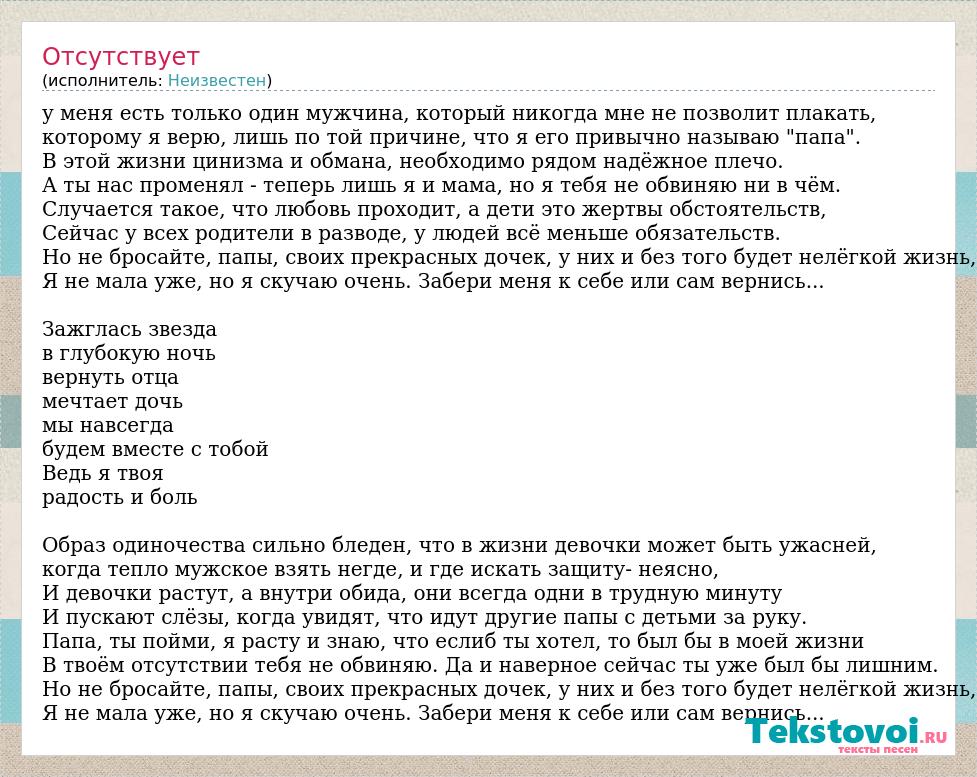 у меня есть только один мужчина, который никогда мне не позволит плакать, которому я верю, лишь по той причине, что я его привычно называю "папа". В этой жизни цинизма и обмана, необходимо рядом надёжное плечо. А ты нас променял - теперь лишь я и мама, но я тебя не обвиняю ни в чём. Случается такое, что любовь проходит, а дети это жертвы обстоятельств, Сейчас у всех родители в разводе, у людей всё меньше обязательств. Но не бросайте, папы, своих прекрасных дочек, у них и без того будет нелёгкой жизнь, Я не мала уже, но я скучаю очень. Забери меня к себе или сам вернись... Зажглась звезда в глубокую ночь вернуть отца мечтает дочь мы навсегда будем вместе с тобой Ведь я твоя радость и боль Образ одиночества сильно бледен, что в жизни девочки может быть ужасней, когда тепло мужское взять негде, и где искать защиту- неясно, И девочки растут, а внутри обида, они всегда одни в трудную минуту И пускают слёзы, когда увидят, что идут другие папы с детьми за руку. Папа, ты пойми, я расту и знаю, что еслиб ты хотел, то был бы в моей жизни В твоём отсутствии тебя не обвиняю. Да и наверное сейчас ты уже был бы лишним. Но не бросайте, папы, своих прекрасных дочек, у них и без того будет нелёгкой жизнь, Я не мала уже, но я скучаю очень. Забери меня к себе или сам вернись...