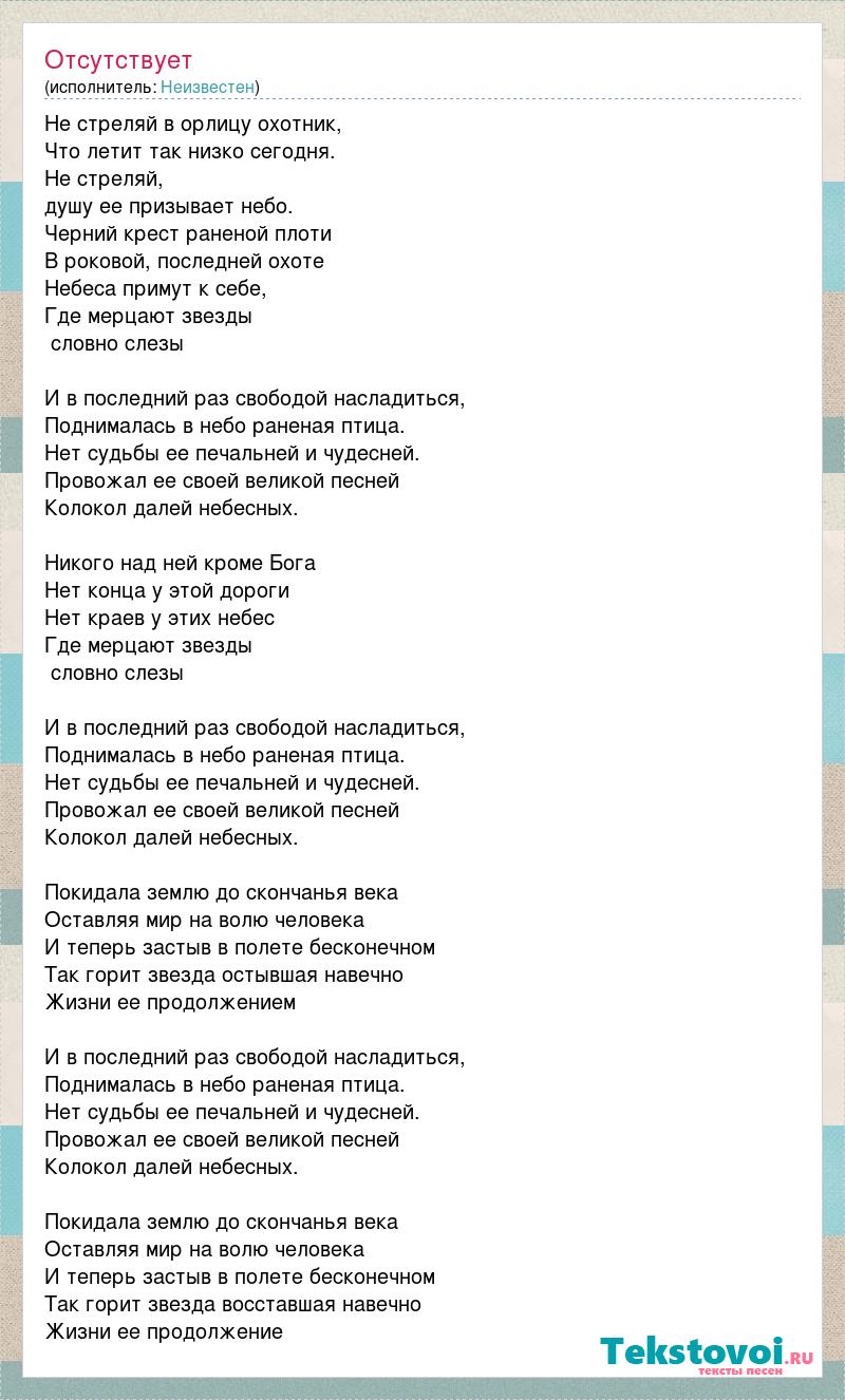 Не стреляй в орлицу охотник, Что летит так низко сегодня. Не стреляй, душу ее призывает небо. Черний крест раненой плоти В роковой, последней охоте Небеса примут к себе, Где мерцают звезды словно слезы И в последний раз свободой насладиться, Поднималась в небо раненая птица. Нет судьбы ее печальней и чудесней. Провожал ее своей великой песней Колокол далей небесных. Никого над ней кроме Бога Нет конца у этой дороги Нет краев у этих небес Где мерцают звезды словно слезы И в последний раз свободой насладиться, Поднималась в небо раненая птица. Нет судьбы ее печальней и чудесней. Провожал ее своей великой песней Колокол далей небесных. Покидала землю до скончанья века Оставляя мир на волю человека И теперь застыв в полете бесконечном Так горит звезда остывшая навечно Жизни ее продолжением И в последний раз свободой насладиться, Поднималась в небо раненая птица. Нет судьбы ее печальней и чудесней. Провожал ее своей великой песней Колокол далей небесных. Покидала землю до скончанья века Оставляя мир на волю человека И теперь застыв в полете бесконечном Так горит звезда восставшая навечно Жизни ее продолжение