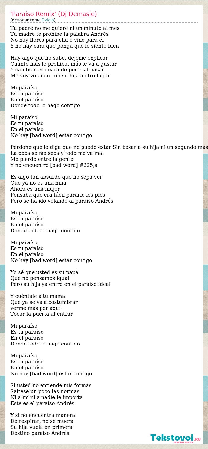 Tu padre no me quiere ni un minuto al mes Tu madre te prohíbe la palabra Andrés No hay flores para ella o vino para él Y no hay cara que ponga que le siente bien Hay algo que no sabe, déjeme explicar Cuanto más le prohiba, más le va a gustar Y cambien esa cara de perro al pasar Me voy volando con su hija a otro lugar Mi paraíso Es tu paraíso En el paraíso Donde todo lo hago contigo Mi paraíso Es tu paraíso En el paraíso No hay [bad word] estar contigo Perdone que le diga que no puedo estar Sin besar a su hija ni un segundo más La boca se me seca y todo me va mal Me pierdo entre la gente Y no encuentro [bad word] #225;s Es algo tan absurdo que no sepa ver Que ya no es una niña Ahora es una mujer Pensaba que era fácil pararle los pies Pero se ha ido volando al paraíso Andrés Mi paraíso Es tu paraíso En el paraíso Donde todo lo hago contigo Mi paraíso Es tu paraíso En el paraíso No hay [bad word] estar contigo Yo sé que usted es su papá Que no pensamos igual Pero su hija ya entro en el paraíso ideal Y cuéntale a tu mama Que ya se va a costumbrar verme más por aquí Tocar la puerta al entrar Mi paraíso Es tu paraíso En el paraíso Donde todo lo hago contigo Mi paraíso Es tu paraíso En el paraíso No hay [bad word] estar contigo Si usted no entiende mis formas Saltese un poco las normas Ni a mí ni a nadie le importa Este es el paraíso Andrés Y si no encuentra manera De respirar, no se muera Su hija vuela en primera Destino paraíso Andrés