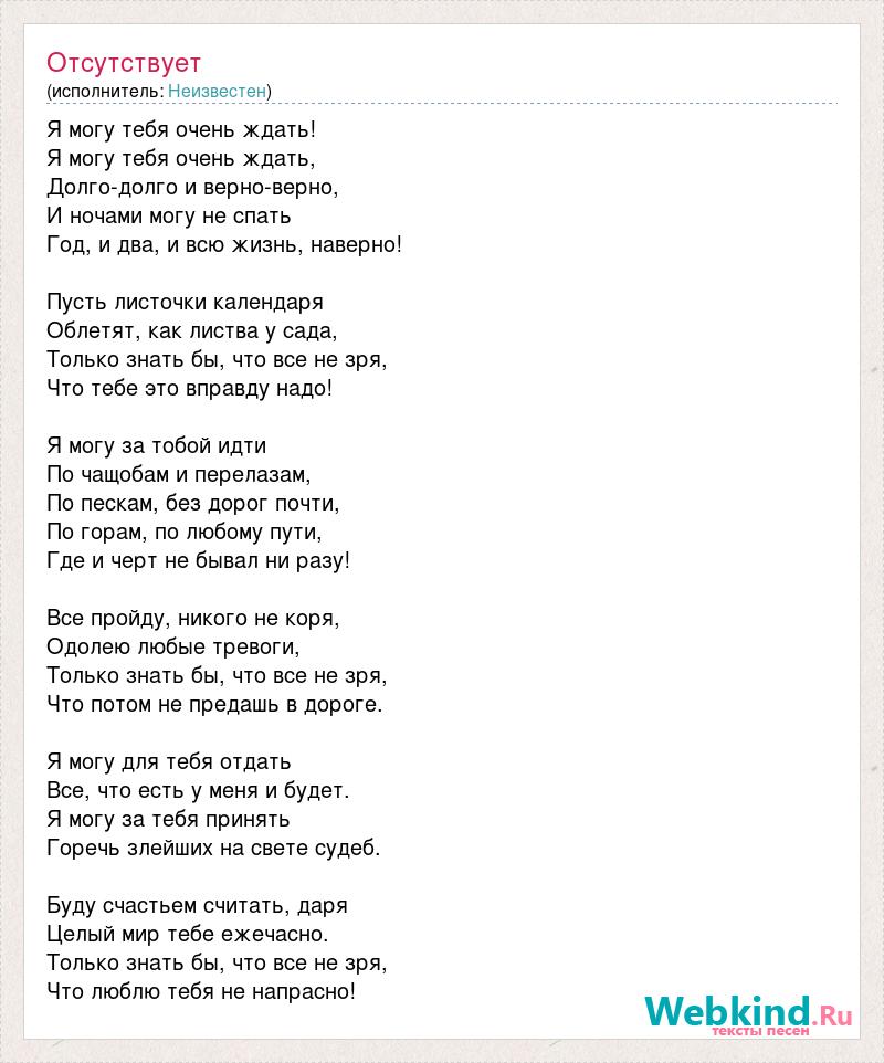Я могу тебя очень ждать! Я могу тебя очень ждать, Долго-долго и верно-верно, И ночами могу не спать Год, и два, и всю жизнь, наверно! Пусть листочки календаря Облетят, как листва у сада, Только знать бы, что все не зря, Что тебе это вправду надо! Я могу за тобой идти По чащобам и перелазам, По пескам, без дорог почти, По горам, по любому пути, Где и черт не бывал ни разу! Все пройду, никого не коря, Одолею любые тревоги, Только знать бы, что все не зря, Что потом не предашь в дороге. Я могу для тебя отдать Все, что есть у меня и будет. Я могу за тебя принять Горечь злейших на свете судеб. Буду счастьем считать, даря Целый мир тебе ежечасно. Только знать бы, что все не зря, Что люблю тебя не напрасно!