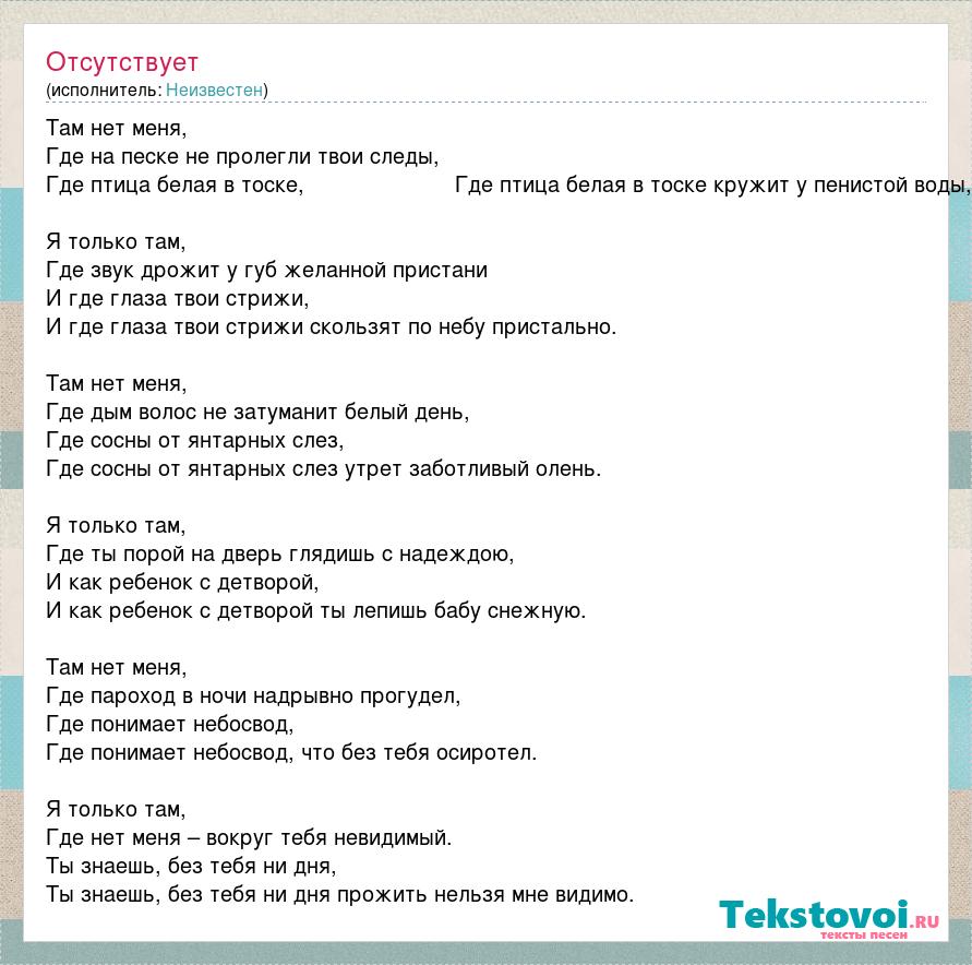 Там нет меня, Где на песке не пролегли твои следы, Где птица белая в тоске, Где птица белая в тоске кружит у пенистой воды, Я только там, Где звук дрожит у губ желанной пристани И где глаза твои стрижи, И где глаза твои стрижи скользят по небу пристально. Там нет меня, Где дым волос не затуманит белый день, Где сосны от янтарных слез, Где сосны от янтарных слез утрет заботливый олень. Я только там, Где ты порой на дверь глядишь с надеждою, И как ребенок с детворой, И как ребенок с детворой ты лепишь бабу снежную. Там нет меня, Где пароход в ночи надрывно прогудел, Где понимает небосвод, Где понимает небосвод, что без тебя осиротел. Я только там, Где нет меня – вокруг тебя невидимый. Ты знаешь, без тебя ни дня, Ты знаешь, без тебя ни дня прожить нельзя мне видимо.