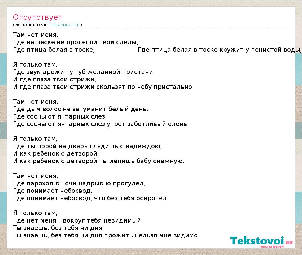 Там нет меня, Где на песке не пролегли твои следы, Где птица белая в тоске, Где птица белая в тоске кружит у пенистой воды, Я только там, Где звук дрожит у губ желанной пристани И где глаза твои стрижи, И где глаза твои стрижи скользят по небу пристально. Там нет меня, Где дым волос не затуманит белый день, Где сосны от янтарных слез, Где сосны от янтарных слез утрет заботливый олень. Я только там, Где ты порой на дверь глядишь с надеждою, И как ребенок с детворой, И как ребенок с детворой ты лепишь бабу снежную. Там нет меня, Где пароход в ночи надрывно прогудел, Где понимает небосвод, Где понимает небосвод, что без тебя осиротел. Я только там, Где нет меня – вокруг тебя невидимый. Ты знаешь, без тебя ни дня, Ты знаешь, без тебя ни дня прожить нельзя мне видимо.
