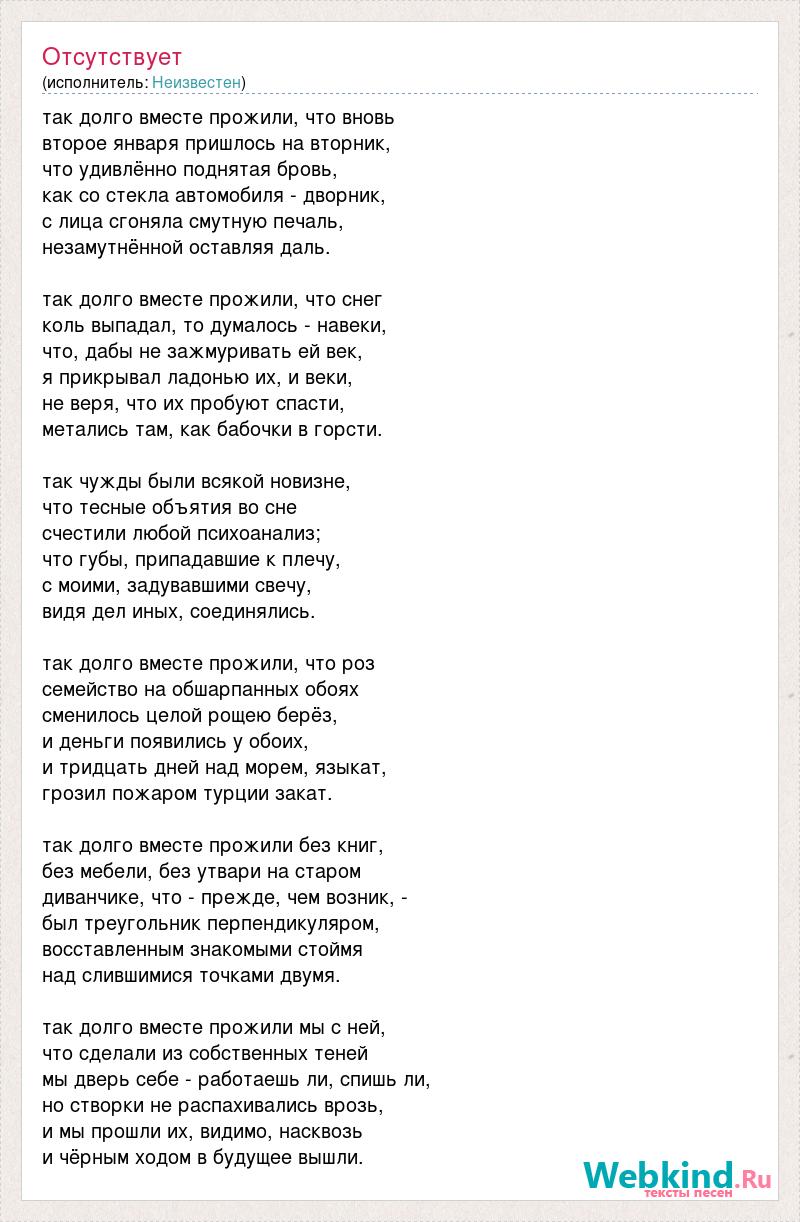 так долго вместе прожили, что вновь второе января пришлось на вторник, что удивлённо поднятая бровь, как со стекла автомобиля - дворник, с лица сгоняла смутную печаль, незамутнённой оставляя даль. так долго вместе прожили, что снег коль выпадал, то думалось - навеки, что, дабы не зажмуривать ей век, я прикрывал ладонью их, и веки, не веря, что их пробуют спасти, метались там, как бабочки в горсти. так чужды были всякой новизне, что тесные объятия во сне счестили любой психоанализ; что губы, припадавшие к плечу, с моими, задувавшими свечу, видя дел иных, соединялись. так долго вместе прожили, что роз семейство на обшарпанных обоях сменилось целой рощею берёз, и деньги появились у обоих, и тридцать дней над морем, языкат, грозил пожаром турции закат. так долго вместе прожили без книг, без мебели, без утвари на старом диванчике, что - прежде, чем возник, - был треугольник перпендикуляром, восставленным знакомыми стоймя над слившимися точками двумя. так долго вместе прожили мы с ней, что сделали из собственных теней мы дверь себе - работаешь ли, спишь ли, но створки не распахивались врозь, и мы прошли их, видимо, насквозь и чёрным ходом в будущее вышли.