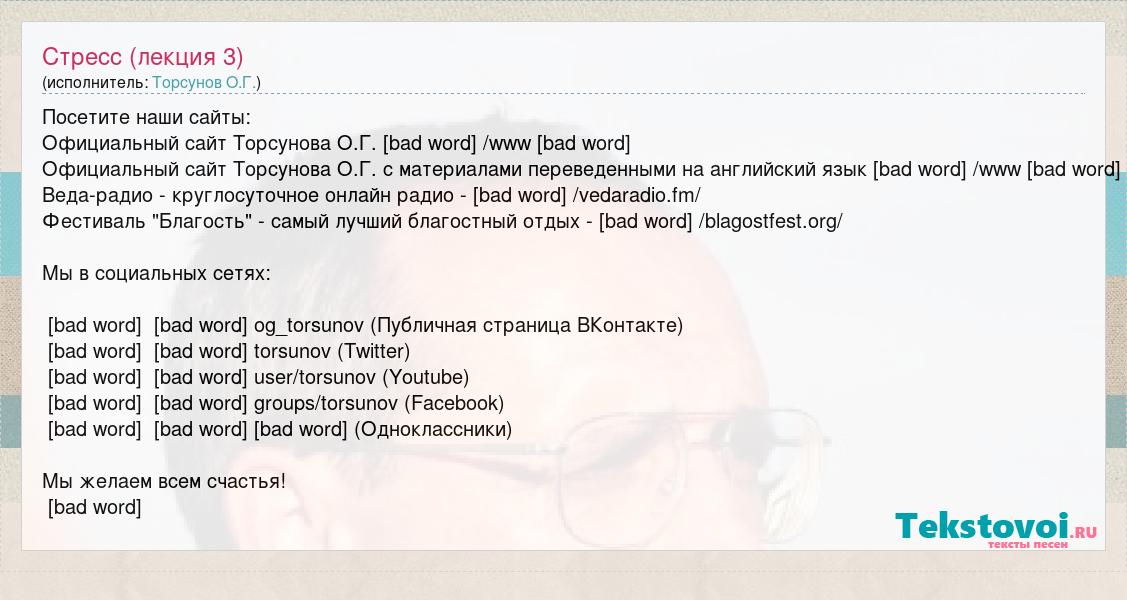 Посетите наши сайты: Официальный сайт Торсунова О.Г. [bad word] /www [bad word] Официальный сайт Торсунова О.Г. с материалами переведенными на английский язык [bad word] /www [bad word] Веда-радио - круглосуточное онлайн радио - [bad word] /vedaradio.fm/ Фестиваль "Благость" - самый лучший благостный отдых - [bad word] /blagostfest.org/ Мы в социальных сетях: [bad word] [bad word] og_torsunov (Публичная страница ВКонтакте) [bad word] [bad word] torsunov (Twitter) [bad word] [bad word] user/torsunov (Youtube) [bad word] [bad word] groups/torsunov (Facebook) [bad word] [bad word] [bad word] (Одноклассники) Мы желаем всем счастья! [bad word]
