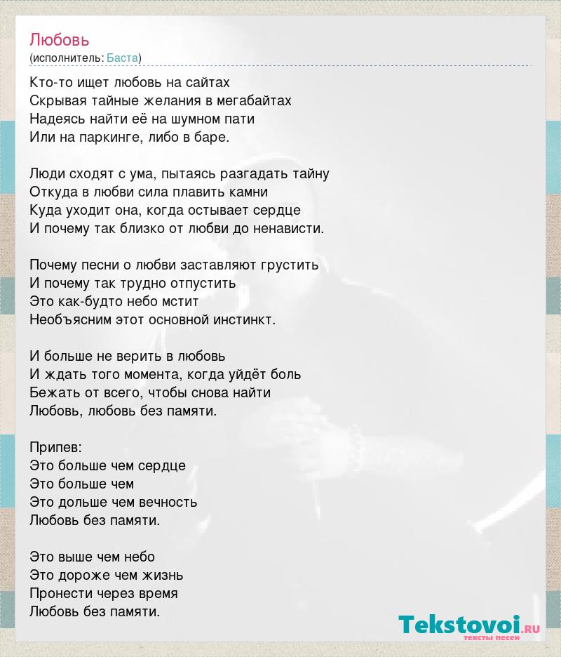 Кто-то ищет любовь на сайтах Скрывая тайные желания в мегабайтах Надеясь найти её на шумном пати Или на паркинге, либо в баре. Люди сходят с ума, пытаясь разгадать тайну Откуда в любви сила плавить камни Куда уходит она, когда остывает сердце И почему так близко от любви до ненависти. Почему песни о любви заставляют грустить И почему так трудно отпустить Это как-будто небо мстит Необъясним этот основной инстинкт. И больше не верить в любовь И ждать того момента, когда уйдёт боль Бежать от всего, чтобы снова найти Любовь, любовь без памяти. Припев: Это больше чем сердце Это больше чем Это дольше чем вечность Любовь без памяти. Это выше чем небо Это дороже чем жизнь Пронести через время Любовь без памяти.