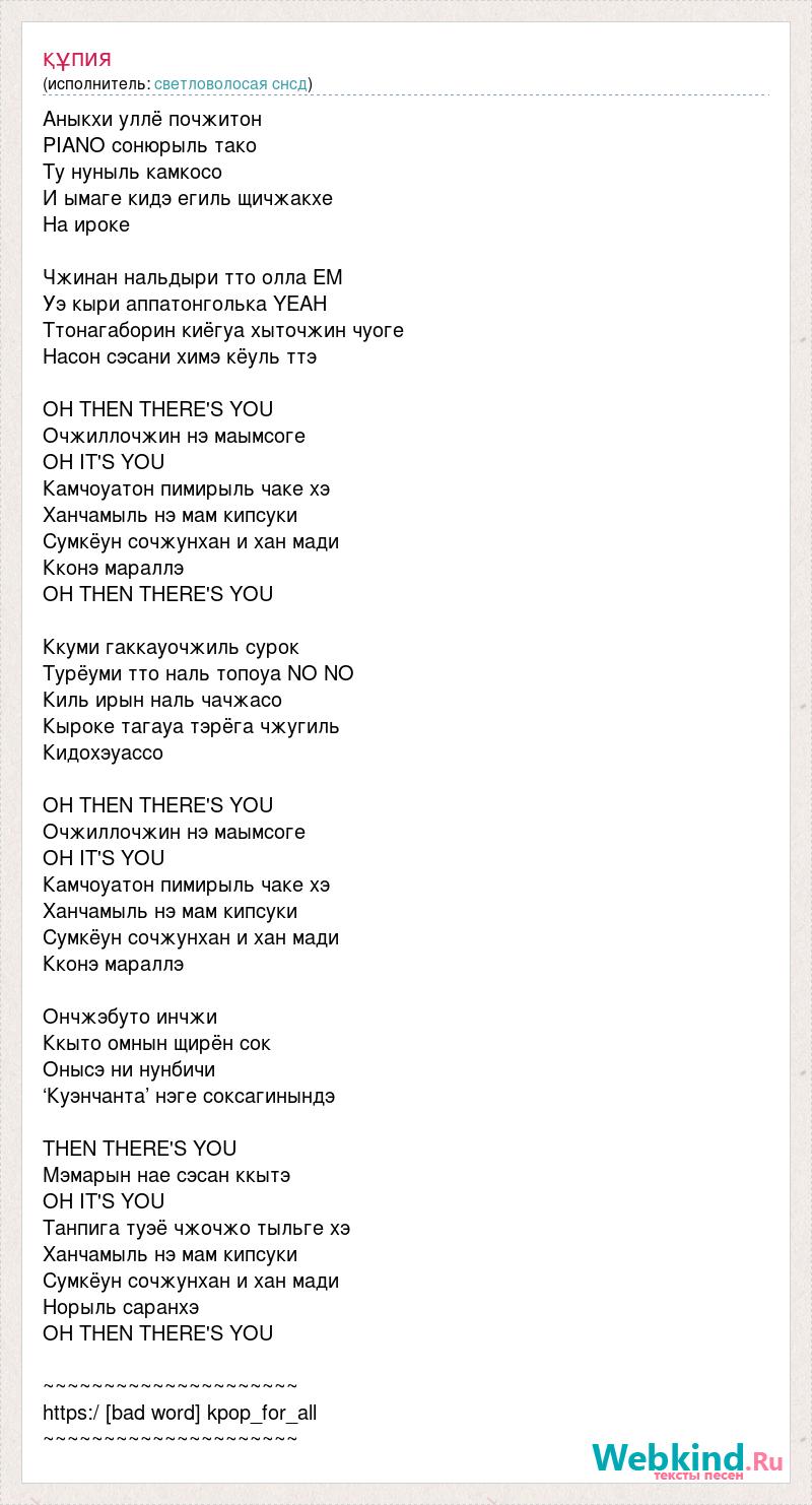 Аныкхи уллё почжитон PIANO сонюрыль тако Ту нуныль камкосо И ымаге кидэ егиль щичжакхе На ироке Чжинан нальдыри тто олла EM Уэ кыри аппатонголька YEAH Ттонагаборин киёгуа хыточжин чуоге Насон сэсани химэ кёуль ттэ OH THEN THERE'S YOU Очжиллочжин нэ маымсоге OH IT'S YOU Камчоуатон пимирыль чаке хэ Ханчамыль нэ мам кипсуки Сумкёун сочжунхан и хан мади Кконэ мараллэ OH THEN THERE'S YOU Ккуми гаккауочжиль сурок Турёуми тто наль топоуа NO NO Киль ирын наль чачжасо Кыроке тагауа тэрёга чжугиль Кидохэуассо OH THEN THERE'S YOU Очжиллочжин нэ маымсоге OH IT'S YOU Камчоуатон пимирыль чаке хэ Ханчамыль нэ мам кипсуки Сумкёун сочжунхан и хан мади Кконэ мараллэ Ончжэбуто инчжи Ккыто омнын щирён сок Онысэ ни нунбичи ‘Куэнчанта’ нэге соксагинындэ THEN THERE'S YOU Мэмарын нае сэсан ккытэ OH IT'S YOU Танпига туэё чжочжо тыльге хэ Ханчамыль нэ мам кипсуки Сумкёун сочжунхан и хан мади Норыль саранхэ OH THEN THERE'S YOU ~~~~~~~~~~~~~~~~~~~~~ https:/ [bad word] kpop_for_all ~~~~~~~~~~~~~~~~~~~~~