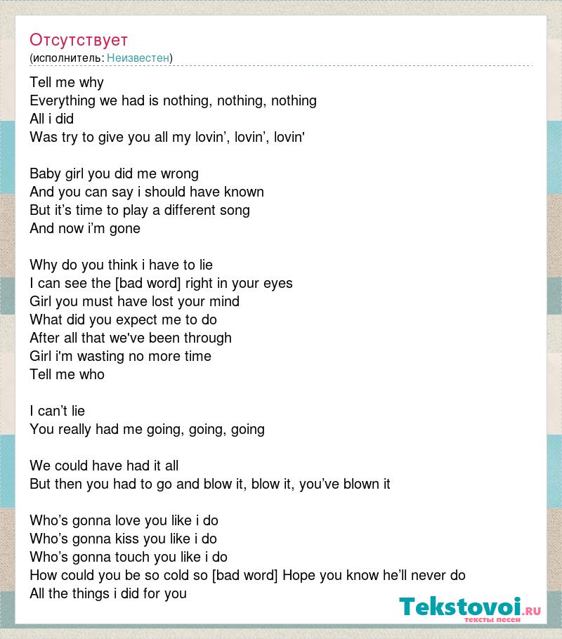Tell me why Everything we had is nothing, nothing, nothing All i did Was try to give you all my lovin’, lovin’, lovin' Baby girl you did me wrong And you can say i should have known But it’s time to play a different song And now i’m gone Why do you think i have to lie I can see the [bad word] right in your eyes Girl you must have lost your mind What did you expect me to do After all that we've been through Girl i'm wasting no more time Tell me who I can’t lie You really had me going, going, going We could have had it all But then you had to go and blow it, blow it, you’ve blown it Who’s gonna love you like i do Who’s gonna kiss you like i do Who’s gonna touch you like i do How could you be so cold so [bad word] Hope you know he’ll never do All the things i did for you