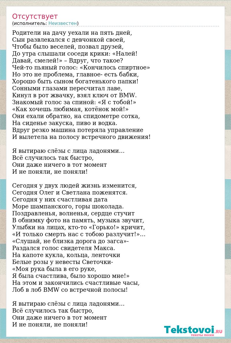 Родители на дачу уехали на пять дней, Сын развлекался с девчонкой своей, Чтобы было веселей, позвал друзей, До утра слышали соседи крики: «Налей! Давай, смелей!» – Вдруг, что такое? Чей-то пьяный голос: «Кончилось спиртное» Но это не проблема, главное- есть бабки, Хорошо быть сыном богатенького папки! Сонными глазами пересчитал лаве, Кинул в рот жвачку, взял ключ от BMW. Знакомый голос за спиной: «Я с тобой!» «Как хочешь любимая, котёнок мой!» Они ехали обратно, на спидометре сотка, На сиденье закуска, пиво и водка. Вдруг резко машина потеряла управление И вылетела на полосу встречного движения! Я вытираю слёзы с лица ладонями… Всё случилось так быстро, Они даже ничего в тот момент И не поняли, не поняли! Сегодня у двух людей жизнь изменится, Сегодня Олег и Светлана поженятся. Сегодня у них счастливая дата Море шампанского, горы шоколада. Поздравленья, волненья, сердце стучит В обнимку фото на память, музыка звучит, Улыбки на лицах, кто-то «Горько!» кричит, «И только смерть нас с тобою разлучит!»… «Слушай, не близка дорога до загса»- Раздался голос свидетеля Макса. На капоте кукла, кольца, ленточки Белые розы у невесты Светочки- «Моя рука была в его руке, Я была счастлива, было хорошо мне!» На этом и закончились счастливые часы, Лоб в лоб BMW со встречной полосы! Я вытираю слёзы с лица ладонями… Всё случилось так быстро, Они даже ничего в тот момент И не поняли, не поняли!