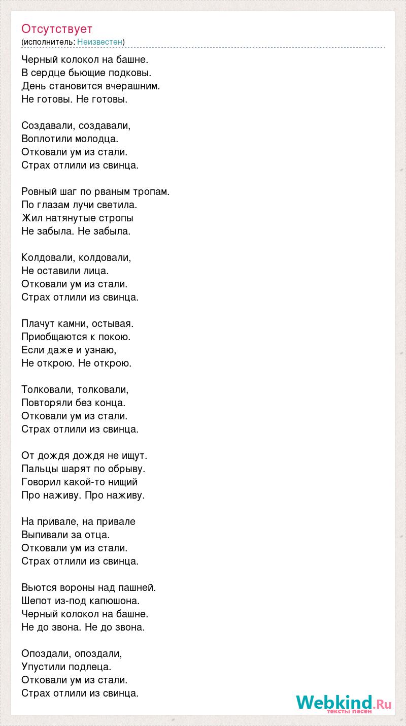 Черный колокол на башне. В сердце бьющие подковы. День становится вчерашним. Не готовы. Не готовы. Создавали, создавали, Воплотили молодца. Отковали ум из стали. Страх отлили из свинца. Ровный шаг по рваным тропам. По глазам лучи светила. Жил натянутые стропы Не забыла. Не забыла. Колдовали, колдовали, Не оставили лица. Отковали ум из стали. Страх отлили из свинца. Плачут камни, остывая. Приобщаются к покою. Если даже и узнаю, Не открою. Не открою. Толковали, толковали, Повторяли без конца. Отковали ум из стали. Страх отлили из свинца. От дождя дождя не ищут. Пальцы шарят по обрыву. Говорил какой-то нищий Про наживу. Про наживу. На привале, на привале Выпивали за отца. Отковали ум из стали. Страх отлили из свинца. Вьются вороны над пашней. Шепот из-под капюшона. Черный колокол на башне. Не до звона. Не до звона. Опоздали, опоздали, Упустили подлеца. Отковали ум из стали. Страх отлили из свинца.