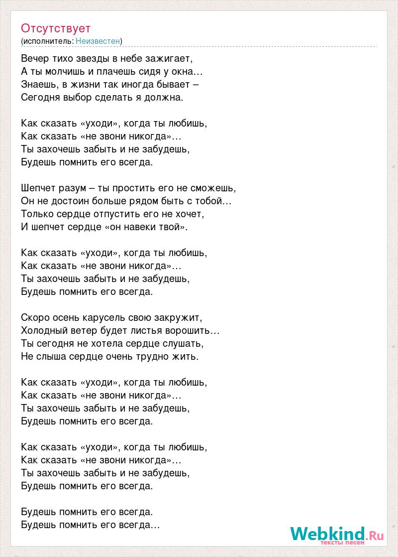 Вечер тихо звезды в небе зажигает, А ты молчишь и плачешь сидя у окна… Знаешь, в жизни так иногда бывает – Сегодня выбор сделать я должна. Как сказать «уходи», когда ты любишь, Как сказать «не звони никогда»… Ты захочешь забыть и не забудешь, Будешь помнить его всегда. Шепчет разум – ты простить его не сможешь, Он не достоин больше рядом быть с тобой… Только сердце отпустить его не хочет, И шепчет сердце «он навеки твой». Как сказать «уходи», когда ты любишь, Как сказать «не звони никогда»… Ты захочешь забыть и не забудешь, Будешь помнить его всегда. Скоро осень карусель свою закружит, Холодный ветер будет листья ворошить… Ты сегодня не хотела сердце слушать, Не слыша сердце очень трудно жить. Как сказать «уходи», когда ты любишь, Как сказать «не звони никогда»… Ты захочешь забыть и не забудешь, Будешь помнить его всегда. Как сказать «уходи», когда ты любишь, Как сказать «не звони никогда»… Ты захочешь забыть и не забудешь, Будешь помнить его всегда. Будешь помнить его всегда. Будешь помнить его всегда…