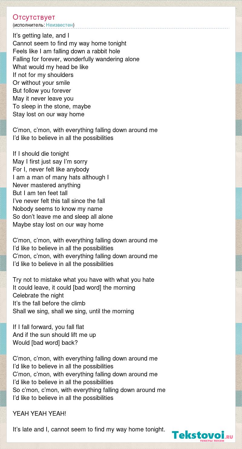 It’s getting late, and I Cannot seem to find my way home tonight Feels like I am falling down a rabbit hole Falling for forever, wonderfully wandering alone What would my head be like If not for my shoulders Or without your smile But follow you forever May it never leave you To sleep in the stone, maybe Stay lost on our way home C’mon, c’mon, with everything falling down around me I’d like to believe in all the possibilities If I should die tonight May I first just say I’m sorry For I, never felt like anybody I am a man of many hats although I Never mastered anything But I am ten feet tall I’ve never felt this tall since the fall Nobody seems to know my name So don’t leave me and sleep all alone Maybe stay lost on our way home C’mon, c’mon, with everything falling down around me I’d like to believe in all the possibilities C’mon, c’mon, with everything falling down around me I’d like to believe in all the possibilities Try not to mistake what you have with what you hate It could leave, it could [bad word] the morning Celebrate the night It’s the fall before the climb Shall we sing, shall we sing, until the morning If I fall forward, you fall flat And if the sun should lift me up Would [bad word] back? C’mon, c’mon, with everything falling down around me I’d like to believe in all the possibilities C’mon, c’mon, with everything falling down around me I’d like to believe in all the possibilities So c’mon, c’mon, with everything falling down around me I’d like to believe in all the possibilities YEAH YEAH YEAH! It’s late and I, cannot seem to find my way home tonight.