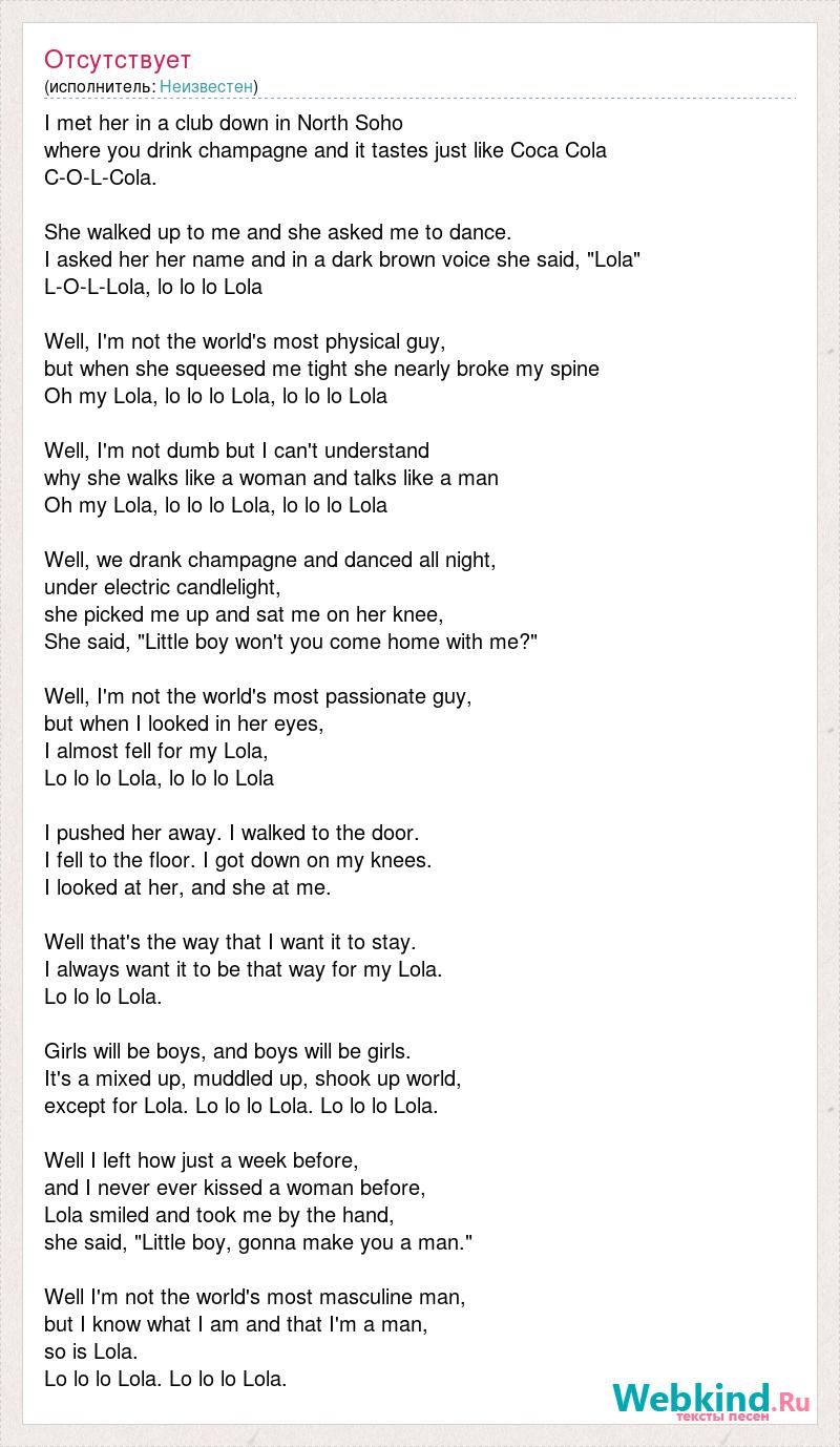 I met her in a club down in North Soho where you drink champagne and it tastes just like Coca Cola C-O-L-Cola. She walked up to me and she asked me to dance. I asked her her name and in a dark brown voice she said, "Lola" L-O-L-Lola, lo lo lo Lola Well, I'm not the world's most physical guy, but when she squeesed me tight she nearly broke my spine Oh my Lola, lo lo lo Lola, lo lo lo Lola Well, I'm not dumb but I can't understand why she walks like a woman and talks like a man Oh my Lola, lo lo lo Lola, lo lo lo Lola Well, we drank champagne and danced all night, under electric candlelight, she picked me up and sat me on her knee, She said, "Little boy won't [bad word] home with me?" Well, I'm not the world's most passionate guy, but when I looked in her eyes, I almost fell for my Lola, Lo lo lo Lola, lo lo lo Lola I pushed her away. I walked to the door. I fell to the floor. I got down on my knees. I looked at her, and she at me. Well that's the way that I want it to stay. I always want it to be that way for my Lola. Lo lo lo Lola. Girls will be boys, and boys will be girls. It's a mixed up, muddled up, shook up world, except for Lola. Lo lo lo Lola. Lo lo lo Lola. Well I left how just a week before, and I never ever kissed a woman before, Lola smiled and took me by the hand, she said, "Little boy, gonna make you a man." Well I'm not the world's most masculine man, but I know what I am and that I'm a man, so is Lola. Lo lo lo Lola. Lo lo lo Lola.