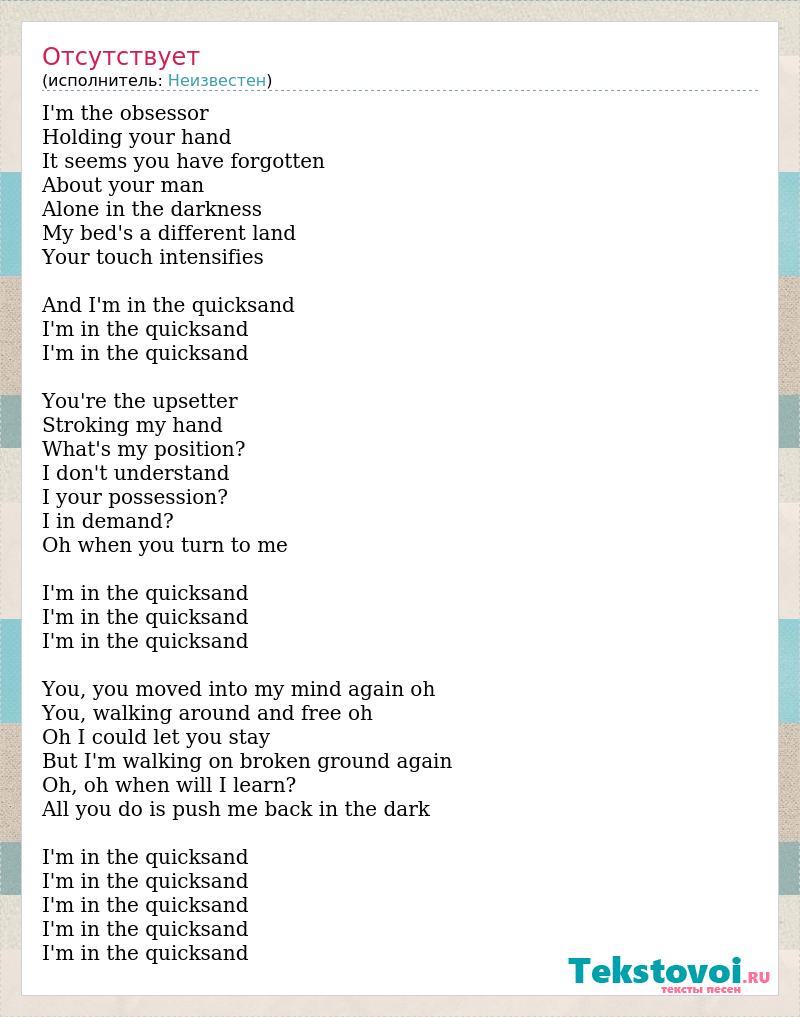 I'm the obsessor Holding your hand It seems you have forgotten About your man Alone in the darkness My bed's a different land Your touch intensifies And I'm in the quicksand I'm in the quicksand I'm in the quicksand You're the upsetter Stroking my hand What's my position? I don't understand I your possession? I in demand? Oh when you turn to me I'm in the quicksand I'm in the quicksand I'm in the quicksand You, you moved into my mind again oh You, walking around and free oh Oh I could let you stay But I'm walking on broken ground again Oh, oh when will I learn? All you do is push me back in the dark I'm in the quicksand I'm in the quicksand I'm in the quicksand I'm in the quicksand I'm in the quicksand