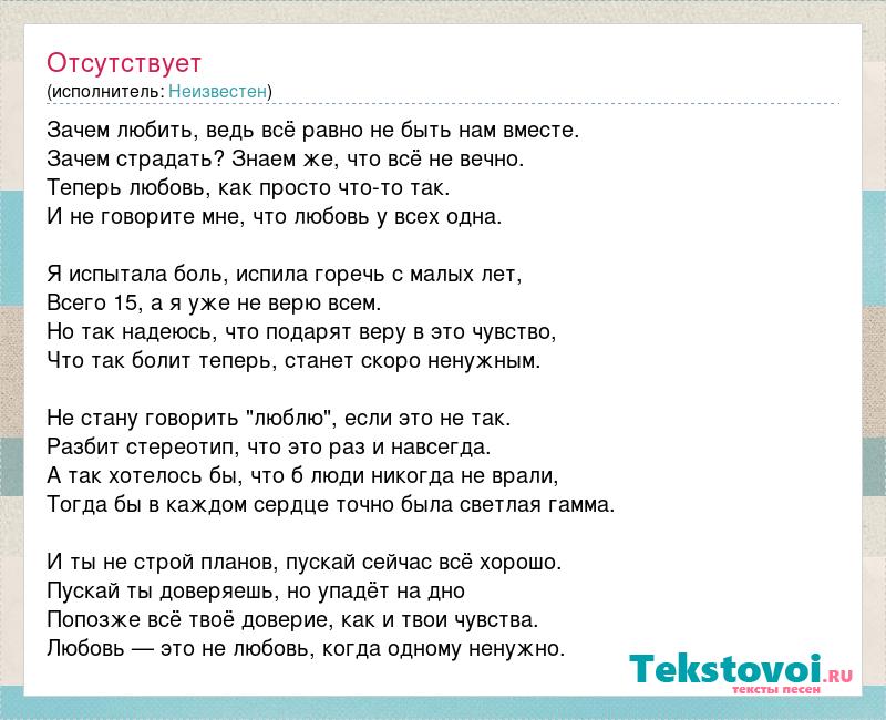 Зачем любить, ведь всё равно не быть нам вместе. Зачем страдать? Знаем же, что всё не вечно. Теперь любовь, как просто что-то так. И не говорите мне, что любовь у всех одна. Я испытала боль, испила горечь с малых лет, Всего 15, а я уже не верю всем. Но так надеюсь, что подарят веру в это чувство, Что так болит теперь, станет скоро ненужным. Не стану говорить "люблю", если это не так. Разбит стереотип, что это раз и навсегда. А так хотелось бы, что б люди никогда не врали, Тогда бы в каждом сердце точно была светлая гамма. И ты не строй планов, пускай сейчас всё хорошо. Пускай ты доверяешь, но упадёт на дно Попозже всё твоё доверие, как и твои чувства. Любовь — это не любовь, когда одному ненужно.