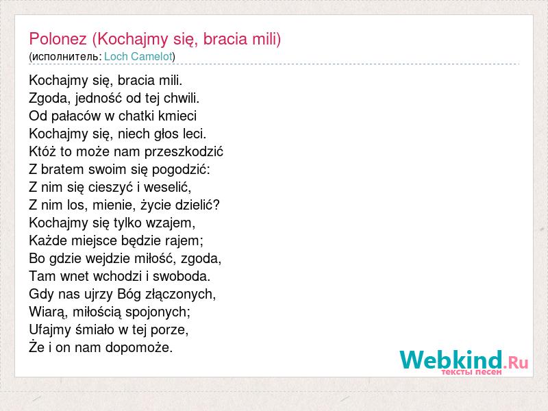 Kochajmy się, bracia mili. Zgoda, jedność od tej chwili. Od pałaców w chatki kmieci Kochajmy się, niech głos leci. Któż to może nam przeszkodzić Z bratem swoim się pogodzić: Z nim się cieszyć i weselić, Z nim los, mienie, życie dzielić? Kochajmy się tylko wzajem, Każde miejsce będzie rajem; Bo gdzie wejdzie miłość, zgoda, Tam wnet wchodzi i swoboda. Gdy nas ujrzy Bóg złączonych, Wiarą, miłością spojonych; Ufajmy śmiało w tej porze, Że i on nam dopomoże.