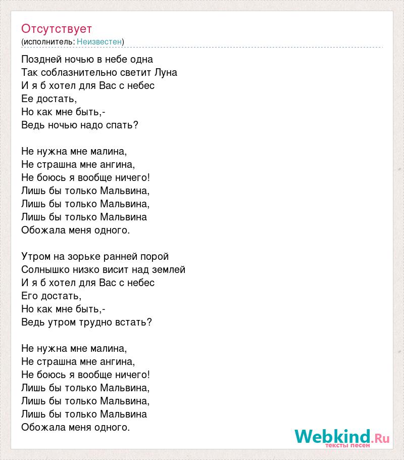 Поздней ночью в небе одна Так соблазнительно светит Луна И я б хотел для Вас с небес Ее достать, Но как мне быть,- Ведь ночью надо спать? Не нужна мне малина, Не страшна мне ангина, Не боюсь я вообще ничего! Лишь бы только Мальвина, Лишь бы только Мальвина, Лишь бы только Мальвина Обожала меня одного. Утром на зорьке ранней порой Солнышко низко висит над землей И я б хотел для Вас с небес Его достать, Но как мне быть,- Ведь утром трудно встать? Не нужна мне малина, Не страшна мне ангина, Не боюсь я вообще ничего! Лишь бы только Мальвина, Лишь бы только Мальвина, Лишь бы только Мальвина Обожала меня одного.