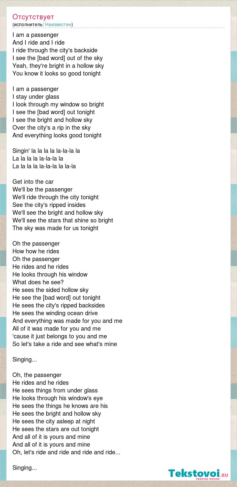 I am a passenger And I ride and I ride I ride through the city's backside I see the [bad word] out of the sky Yeah, they're bright in a hollow sky You know it looks so good tonight I am a passenger I stay under glass I look through my window so bright I see the [bad word] out tonight I see the bright and hollow sky Over the city's a rip in the sky And everything looks good tonight Singin' la la la la la-la-la la La la la la la-la-la la La la la la la-la-la la la-la Get into the car We'll be the passenger We'll ride through the city tonight See the city's ripped insides We'll see the bright and hollow sky We'll see the stars that shine so bright The sky was made for us tonight Oh the passenger How how he rides Oh the passenger He rides and he rides He looks through his window What does he see? He sees the sided hollow sky He see the [bad word] out tonight He sees the city's ripped backsides He sees the winding ocean drive And everything was made for you and me All of it was made for you and me 'cause it just belongs to you and me So let's take a ride and see what's mine Singing... Oh, the passenger He rides and he rides He sees things from under glass He looks through his window's eye He sees the things he knows are his He sees the bright and hollow sky He sees the city asleep at night He sees the stars are out tonight And all of it is yours and mine And all of it is yours and mine Oh, let's ride and ride and ride and ride... Singing...