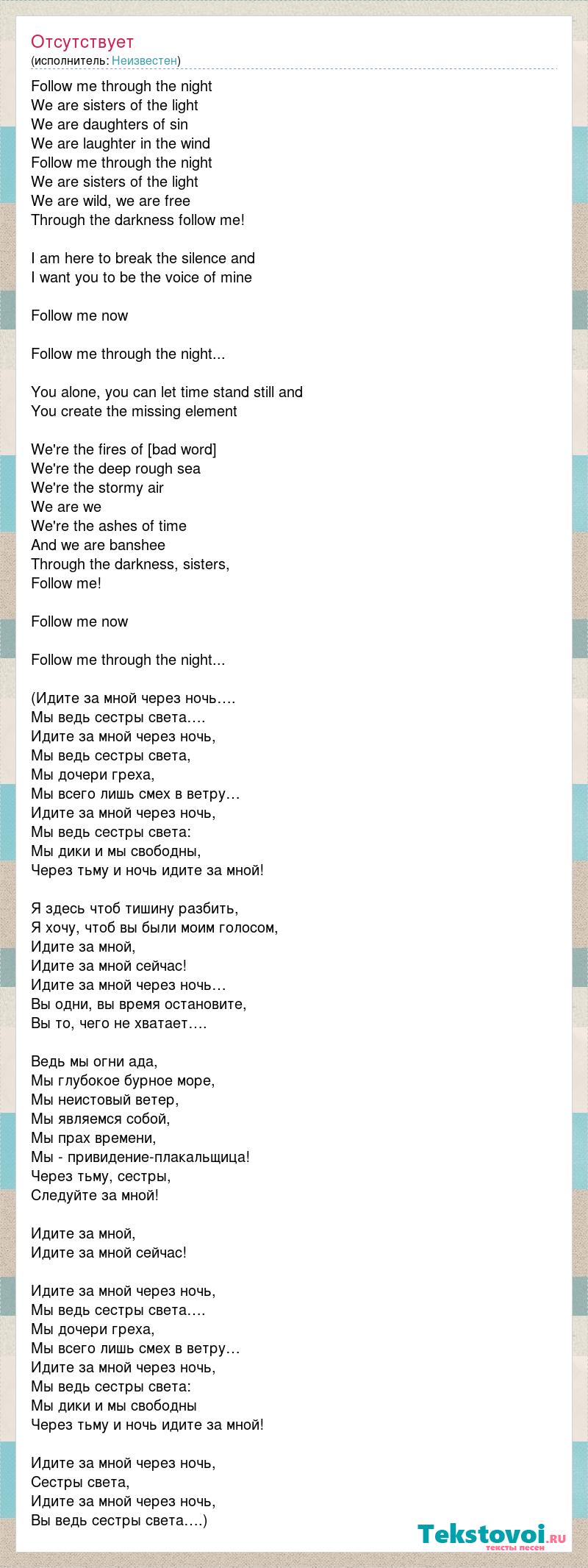 Follow me through the night We are sisters of the light We are daughters of sin We are laughter in the wind Follow me through the night We are sisters of the light We are wild, we are free Through the darkness follow me! I am here to break the silence and I want you to be the voice of mine Follow me now Follow me through the night... You alone, you can let time stand still and You create the missing element We're the fires of [bad word] We're the deep rough sea We're the stormy air We are we We're the ashes of time And we are banshee Through the darkness, sisters, Follow me! Follow me now Follow me through the night... (Идите за мной через ночь…. Мы ведь сестры света…. Идите за мной через ночь, Мы ведь сестры света, Мы дочери греха, Мы всего лишь смех в ветру… Идите за мной через ночь, Мы ведь сестры света: Мы дики и мы свободны, Через тьму и ночь идите за мной! Я здесь чтоб тишину разбить, Я хочу, чтоб вы были моим голосом, Идите за мной, Идите за мной сейчас! Идите за мной через ночь… Вы одни, вы время остановите, Вы то, чего не хватает…. Ведь мы огни ада, Мы глубокое бурное море, Мы неистовый ветер, Мы являемся собой, Мы прах времени, Мы - привидение-плакальщица! Через тьму, сестры, Следуйте за мной! Идите за мной, Идите за мной сейчас! Идите за мной через ночь, Мы ведь сестры света…. Мы дочери греха, Мы всего лишь смех в ветру… Идите за мной через ночь, Мы ведь сестры света: Мы дики и мы свободны Через тьму и ночь идите за мной! Идите за мной через ночь, Сестры света, Идите за мной через ночь, Вы ведь сестры света….)