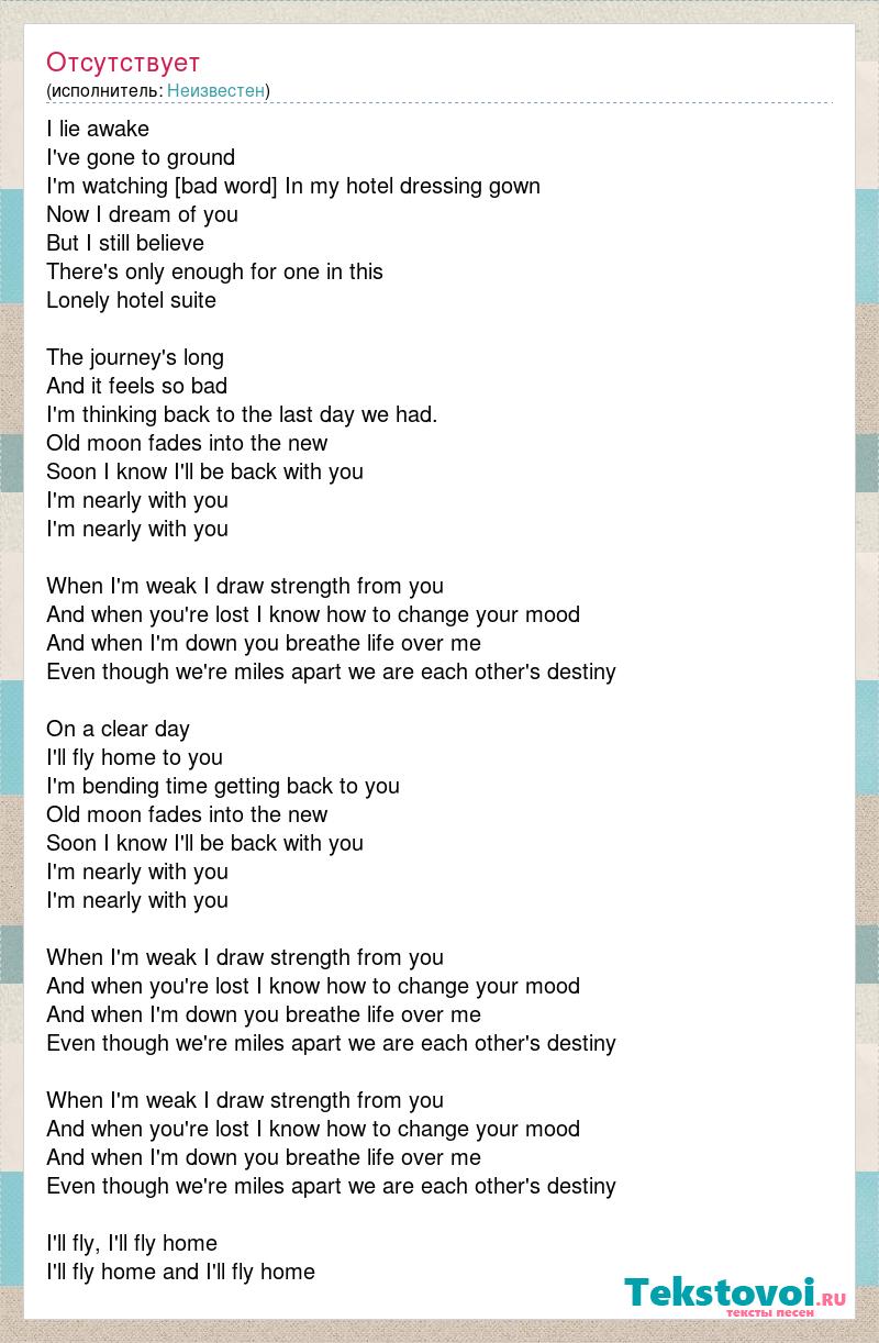 I lie awake I've gone to ground I'm watching [bad word] In my hotel dressing gown Now I dream of you But I still believe There's only enough for one in this Lonely hotel suite The journey's long And it feels so bad I'm thinking back to the last day we had. Old moon fades into the new Soon I know I'll be back with you I'm nearly with you I'm nearly with you When I'm weak I draw strength from you And when you're lost I know how to change your mood And when I'm down you breathe life over me Even though we're miles apart we are each other's destiny On a clear day I'll fly home to you I'm bending time getting back to you Old moon fades into the new Soon I know I'll be back with you I'm nearly with you I'm nearly with you When I'm weak I draw strength from you And when you're lost I know how to change your mood And when I'm down you breathe life over me Even though we're miles apart we are each other's destiny When I'm weak I draw strength from you And when you're lost I know how to change your mood And when I'm down you breathe life over me Even though we're miles apart we are each other's destiny I'll fly, I'll fly home I'll fly home and I'll fly home