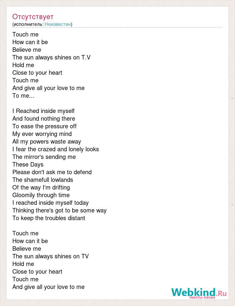Touch me How can it be Believe me The sun always shines on T.V Hold me Close to your heart Touch me And give all your love to me To me... I Reached inside myself And found nothing there To ease the pressure off My ever worrying mind All my powers waste away I fear the crazed and lonely looks The mirror's sending me These Days Please don't ask me to defend The shamefull lowlands Of the way I'm drifting Gloomily through time I reached inside myself today Thinking there's got to be some way To keep the troubles distant Touch me How can it be Believe me The sun always shines on TV Hold me Close to your heart Touch me And give all your love to me