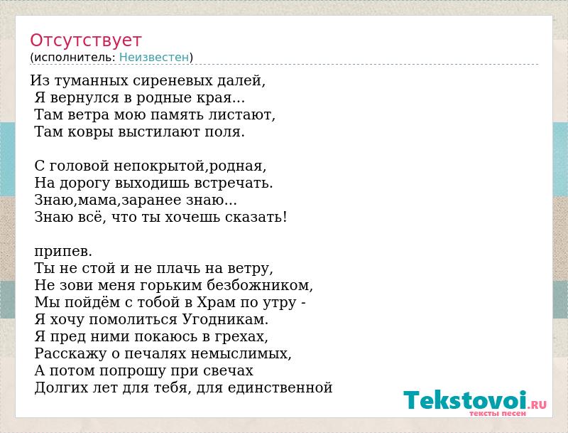 Из туманных сиреневых далей, Я вернулся в родные края... Там ветра мою память листают, Там ковры выстилают поля. С головой непокрытой,родная, На дорогу выходишь встречать. Знаю,мама,заранее знаю... Знаю всё, что ты хочешь сказать! припев. Ты не стой и не плачь на ветру, Не зови меня горьким безбожником, Мы пойдём с тобой в Храм по утру - Я хочу помолиться Угодникам. Я пред ними покаюсь в грехах, Расскажу о печалях немыслимых, А потом попрошу при свечах Долгих лет для тебя, для единственной
