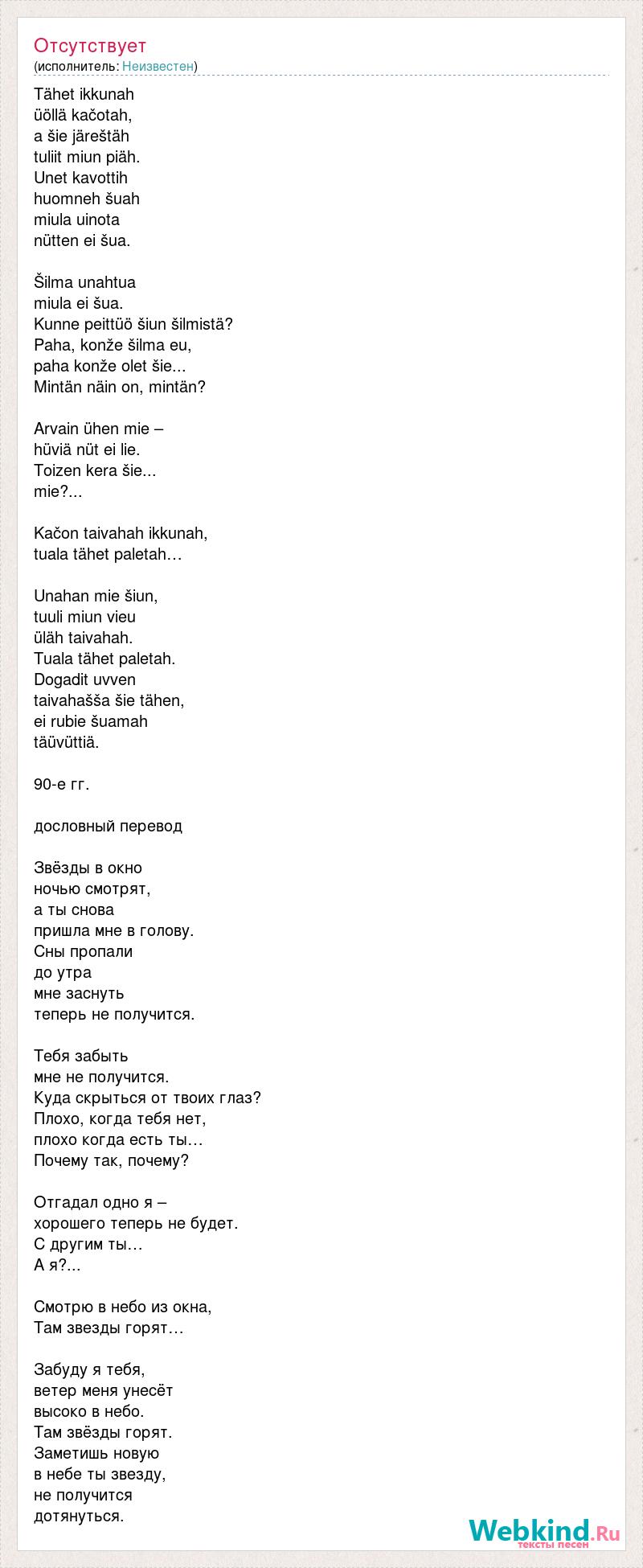Tähet ikkunah üöllä kačotah, a šie järeštäh tuliit miun piäh. Unet kavottih huomneh šuah miula uinota nütten ei šua. Šilma unahtua miula ei šua. Kunne peittüö šiun šilmistä? Paha, konže šilma eu, paha konže olet šie... Mintän näin on, mintän? Arvain ühen mie – hüviä nüt ei lie. Toizen kera šie... mie?... Kačon taivahah ikkunah, tuala tähet paletah… Unahan mie šiun, tuuli miun vieu üläh taivahah. Tuala tähet paletah. Dogadit uvven taivahašša šie tähen, [bad word] šuamah täüvüttiä. 90-е гг. дословный перевод Звёзды в окно ночью смотрят, а ты снова пришла мне в голову. Сны пропали до утра мне заснуть теперь не получится. Тебя забыть мне не получится. Куда скрыться от твоих глаз? Плохо, когда тебя нет, плохо когда есть ты… Почему так, почему? Отгадал одно я – хорошего теперь не будет. С другим ты… А я?... Смотрю в небо из окна, Там звезды горят… Забуду я тебя, ветер меня унесёт высоко в небо. Там звёзды горят. Заметишь новую в небе ты звезду, не получится дотянуться.