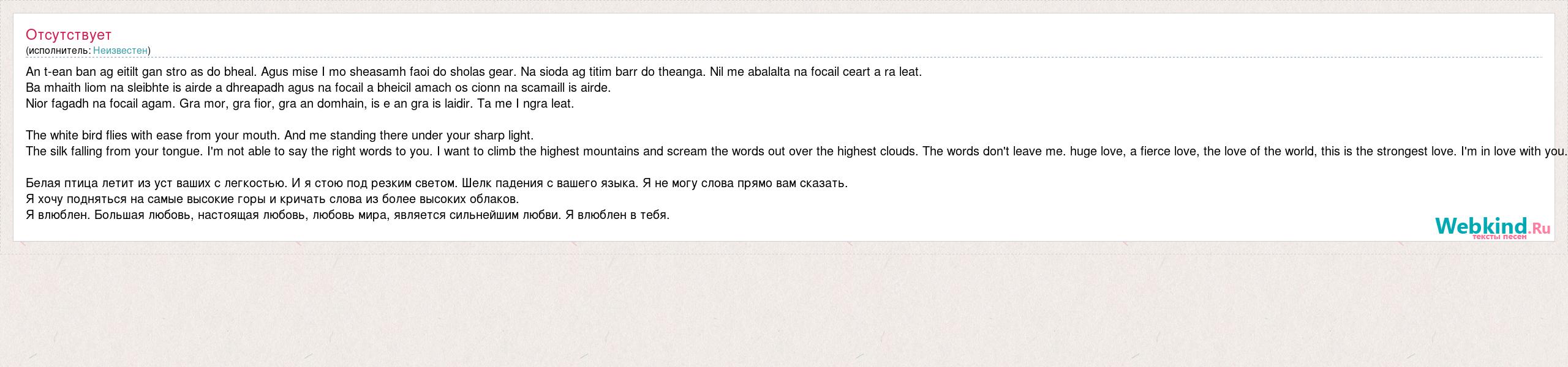 An t-ean ban ag eitilt gan stro as do bheal. Agus mise I mo sheasamh faoi do sholas gear. Na sioda ag titim barr do theanga. Nil me abalalta na focail ceart a ra leat. Ba mhaith liom na sleibhte is airde a dhreapadh agus na focail a bheicil amach os cionn na scamaill is airde. Nior [bad word] na focail agam. Gra mor, gra fior, gra an domhain, is e an gra is laidir. Ta me I ngra leat. The white bird flies with ease from your mouth. And me standing there under your sharp light. The silk falling from your tongue. I'm not able to say the right words to you. I want to climb the highest mountains and scream the words out over the highest clouds. The words don't leave me. huge love, a fierce love, the love of the world, this is the strongest love. I'm in love with you. Белая птица летит из уст ваших с легкостью. И я стою под резким светом. Шелк падения с вашего языка. Я не могу слова прямо вам сказать. Я хочу подняться на самые высокие горы и кричать слова из более высоких облаков. Я влюблен. Большая любовь, настоящая любовь, любовь мира, является сильнейшим любви. Я влюблен в тебя.