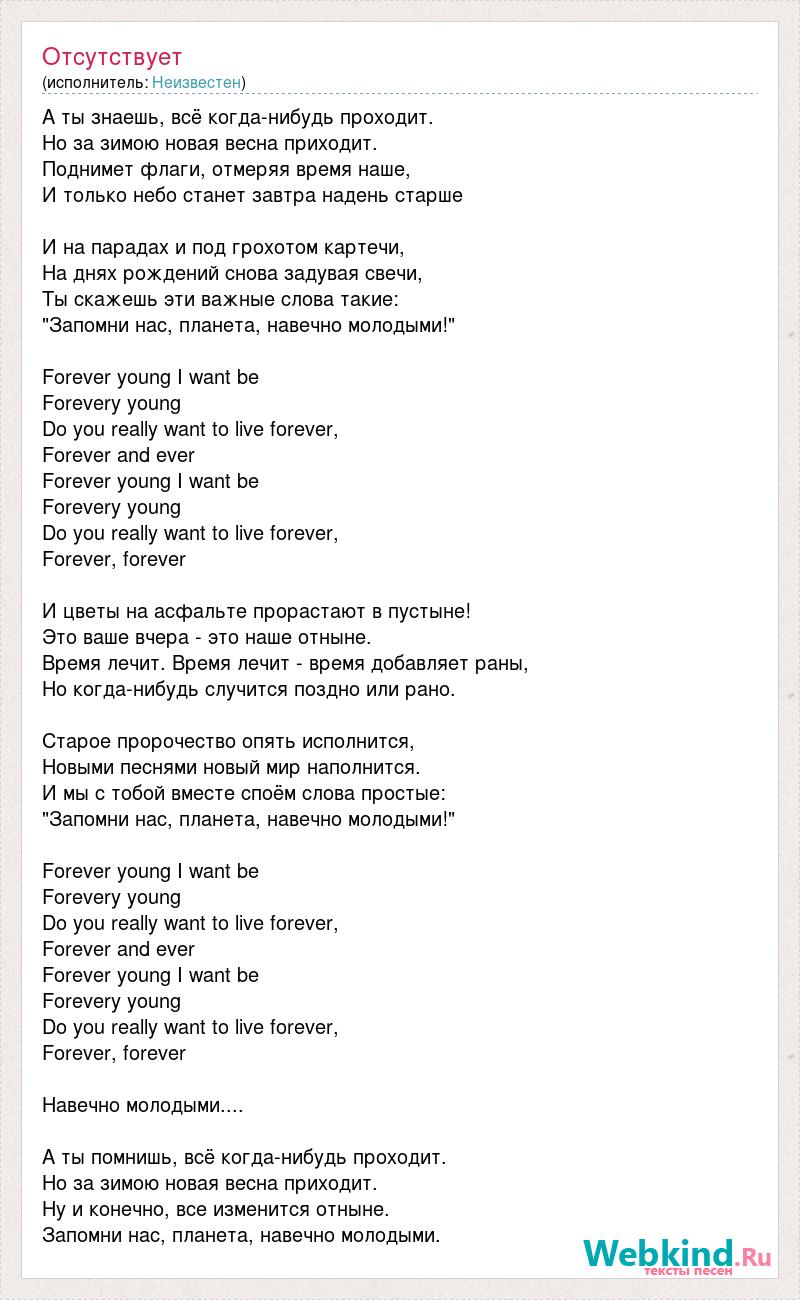 А ты знаешь, всё когда-нибудь проходит. Но за зимою новая весна приходит. Поднимет флаги, отмеряя время наше, И только небо станет завтра надень старше И на парадах и под грохотом картечи, На днях рождений снова задувая свечи, Ты скажешь эти важные слова такие: "Запомни нас, планета, навечно молодыми!" Forever young I want be Forevery young Do you really want to live forever, Forever and ever Forever young I want be Forevery young Do you really want to live forever, Forever, forever И цветы на асфальте прорастают в пустыне! Это ваше вчера - это наше отныне. Время лечит. Время лечит - время добавляет раны, Но когда-нибудь случится поздно или рано. Старое пророчество опять исполнится, Новыми песнями новый мир наполнится. И мы с тобой вместе споём слова простые: "Запомни нас, планета, навечно молодыми!" Forever young I want be Forevery young Do you really want to live forever, Forever and ever Forever young I want be Forevery young Do you really want to live forever, Forever, forever Навечно молодыми.... А ты помнишь, всё когда-нибудь проходит. Но за зимою новая весна приходит. Ну и конечно, все изменится отныне. Запомни нас, планета, навечно молодыми.