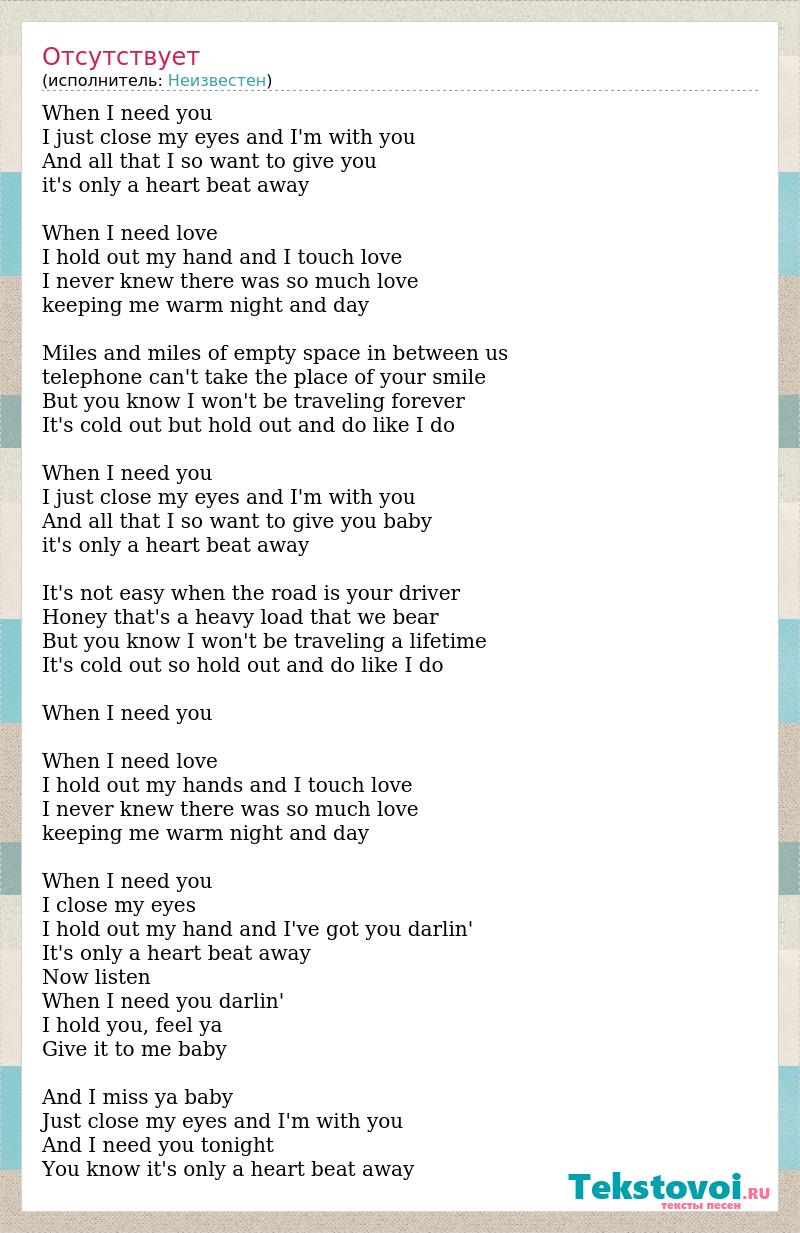 When I need you I just close my eyes and I'm with you And all that I so want to give you it's only a heart beat away When I need love I hold out my hand and I touch love I never knew there was so much love keeping me warm night and day Miles and miles of empty space in between us telephone can't take the place of your smile But you know I won't be traveling forever It's cold out but hold out and do like I do When I need you I just close my eyes and I'm with you And all that I so want to give you baby it's only a heart beat away It's not easy when the road is your driver Honey that's a heavy load that we bear But you know I won't be traveling a lifetime It's cold out so hold out and do like I do When I need you When I need love I hold out my hands and I touch love I never knew there was so much love keeping me warm night and day When I need you I close my eyes I hold out my hand and I've got you darlin' It's only a heart beat away Now listen When I need you darlin' I hold you, feel ya Give it to me baby And I miss ya baby Just close my eyes and I'm with you And I need you tonight You know it's only a heart beat away