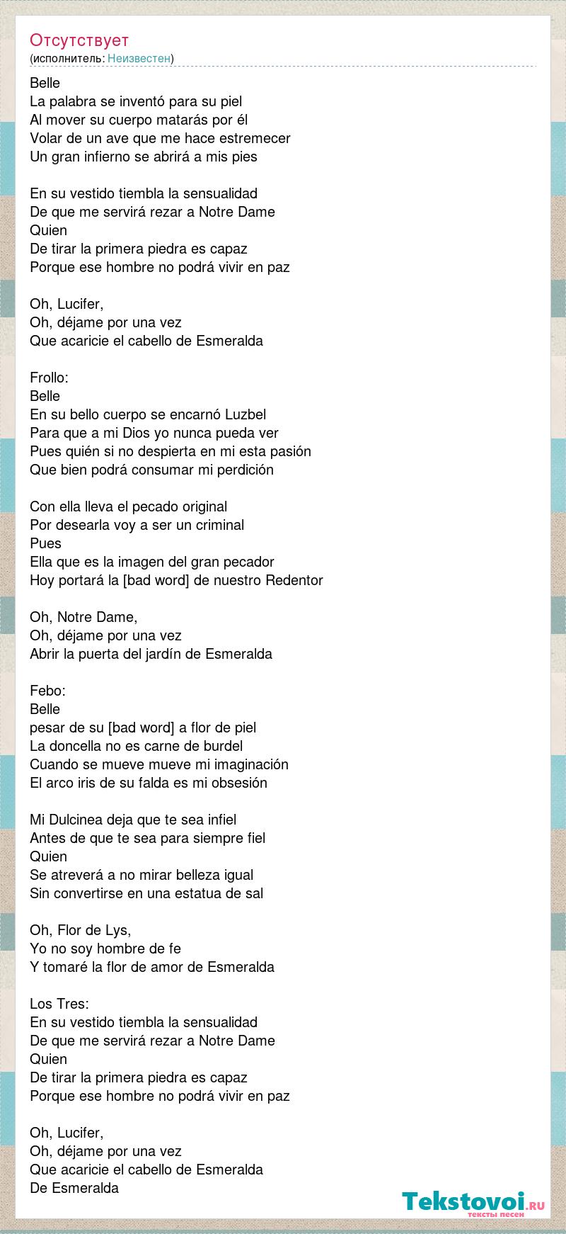 Belle La palabra se inventó para su piel Al mover su cuerpo matarás por él Volar de un ave que me hace estremecer Un gran infierno se abrirá a mis pies En su vestido tiembla la sensualidad De que me servirá rezar a Notre Dame Quien De tirar la primera piedra es capaz Porque ese hombre no podrá vivir en paz Oh, Lucifer, Oh, déjame por una vez Que acaricie el cabello de Esmeralda Frollo: Belle En su bello cuerpo se encarnó Luzbel Para que a mi Dios yo nunca pueda ver Pues quién si no despierta en mi esta pasión Que bien podrá consumar mi perdición Con ella lleva el pecado original Por desearla voy a ser un criminal Pues Ella que es la imagen del gran pecador Hoy portará la [bad word] de nuestro Redentor Oh, Notre Dame, Oh, déjame por una vez Abrir la puerta del jardín de Esmeralda Febo: Belle pesar de su [bad word] a flor de piel La doncella no es carne de burdel Cuando se mueve mueve mi imaginación El arco iris de su falda es mi obsesión Mi Dulcinea deja que te sea infiel Antes de que te sea para siempre fiel Quien Se atreverá a no mirar belleza igual Sin convertirse en una estatua de sal Oh, Flor de Lys, Yo no soy hombre de fe Y tomaré la flor de amor de Esmeralda Los Tres: En su vestido tiembla la sensualidad De que me servirá rezar a Notre Dame Quien De tirar la primera piedra es capaz Porque ese hombre no podrá vivir en paz Oh, Lucifer, Oh, déjame por una vez Que acaricie el cabello de Esmeralda De Esmeralda