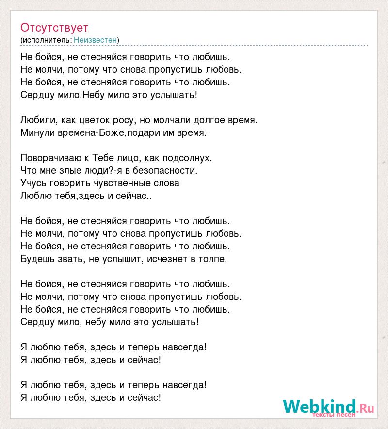 Не бойся, не стесняйся говорить что любишь. Не молчи, потому что снова пропустишь любовь. Не бойся, не стесняйся говорить что любишь. Сердцу мило,Небу мило это услышать! Любили, как цветок росу, но молчали долгое время. Минули времена-Боже,подари им время. Поворачиваю к Тебе лицо, как подсолнух. Что мне злые люди?-я в безопасности. Учусь говорить чувственные слова Люблю тебя,здесь и сейчас.. Не бойся, не стесняйся говорить что любишь. Не молчи, потому что снова пропустишь любовь. Не бойся, не стесняйся говорить что любишь. Будешь звать, не услышит, исчезнет в толпе. Не бойся, не стесняйся говорить что любишь. Не молчи, потому что снова пропустишь любовь. Не бойся, не стесняйся говорить что любишь. Сердцу мило, небу мило это услышать! Я люблю тебя, здесь и теперь навсегда! Я люблю тебя, здесь и сейчас! Я люблю тебя, здесь и теперь навсегда! Я люблю тебя, здесь и сейчас!