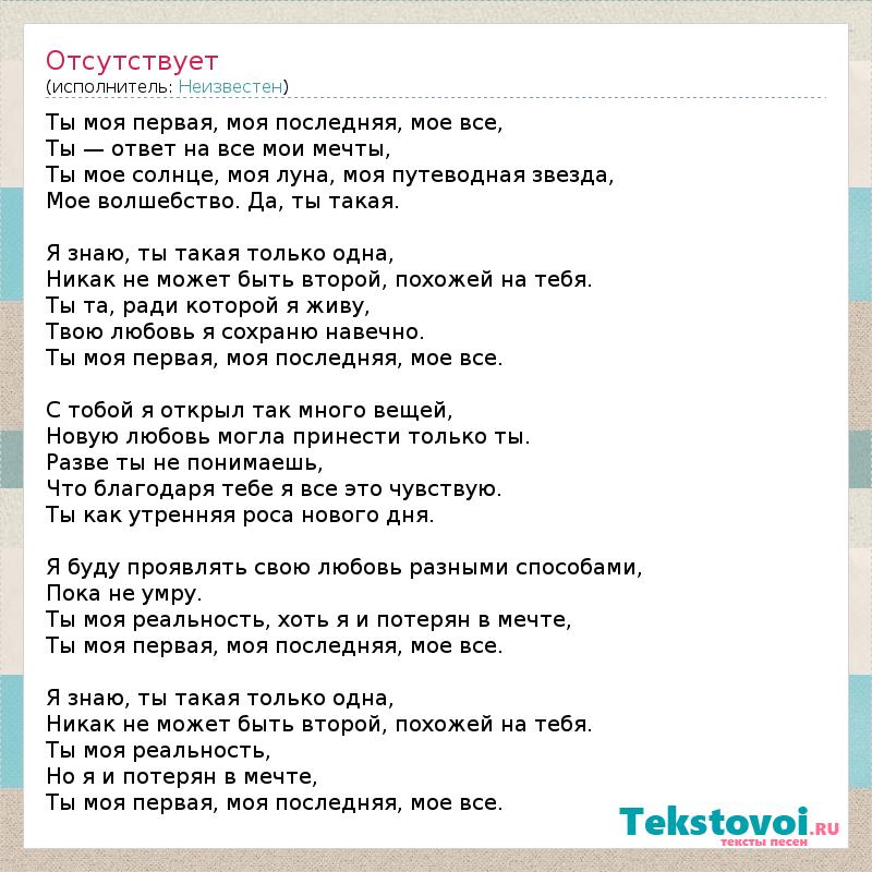 Ты моя первая, моя последняя, мое все, Ты — ответ на все мои мечты, Ты мое солнце, моя луна, моя путеводная звезда, Мое волшебство. Да, ты такая. Я знаю, ты такая только одна, Никак не может быть второй, похожей на тебя. Ты та, ради которой я живу, Твою любовь я сохраню навечно. Ты моя первая, моя последняя, мое все. С тобой я открыл так много вещей, Новую любовь могла принести только ты. Разве ты не понимаешь, Что благодаря тебе я все это чувствую. Ты как утренняя роса нового дня. Я буду проявлять свою любовь разными способами, Пока не умру. Ты моя реальность, хоть я и потерян в мечте, Ты моя первая, моя последняя, мое все. Я знаю, ты такая только одна, Никак не может быть второй, похожей на тебя. Ты моя реальность, Но я и потерян в мечте, Ты моя первая, моя последняя, мое все.
