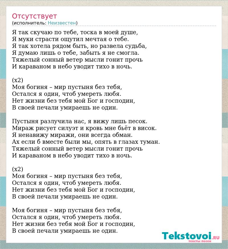 Я так скучаю по тебе, тоска в моей душе, Я муки страсти ощутил мечтая о тебе. Я так хотела рядом быть, но развела судьба, Я думаю лишь о тебе, забыть я не смогла. Тяжелый сонный ветер мысли гонит прочь И караваном в небо уводит тихо в ночь. (х2) Моя богиня – мир пустыня без тебя, Остался я один, чтоб умереть любя. Нет жизни без тебя мой Бог и господин, В своей печали умираешь не один. Пустыня разлучила нас, я вижу лишь песок. Мираж рисует силуэт и кровь мне бьёт в висок. Я ненавижу миражи, они всегда обман. Ах если б вместе были мы, опять в глазах туман. Тяжелый сонный ветер мысли гонит прочь И караваном в небо уводит тихо в ночь. (х2) Моя богиня – мир пустыня без тебя, Остался я один, чтоб умереть любя. Нет жизни без тебя мой Бог и господин, В своей печали умираешь не один. Моя богиня – мир пустыня без тебя, Остался я один, чтоб умереть любя. Нет жизни без тебя мой Бог и господин, В своей печали умираешь не один.