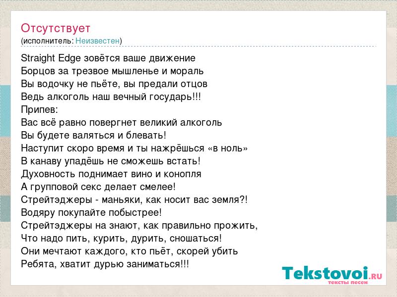 Straight Edge зовётся ваше движение Борцов за трезвое мышленье и мораль Вы водочку не пьёте, вы предали отцов Ведь алкоголь наш вечный государь!!! Припев: Вас всё равно повергнет великий алкоголь Вы будете валяться и блевать! Наступит скоро время и ты нажрёшься «в ноль» В канаву упадёшь не сможешь встать! Духовность поднимает вино и конопля А групповой секс делает смелее! Стрейтэджеры - маньяки, как носит вас земля?! Водяру покупайте побыстрее! Стрейтэджеры на знают, как правильно прожить, Что надо пить, курить, дурить, сношаться! Они мечтают каждого, кто пьёт, скорей убить Ребята, хватит дурью заниматься!!!