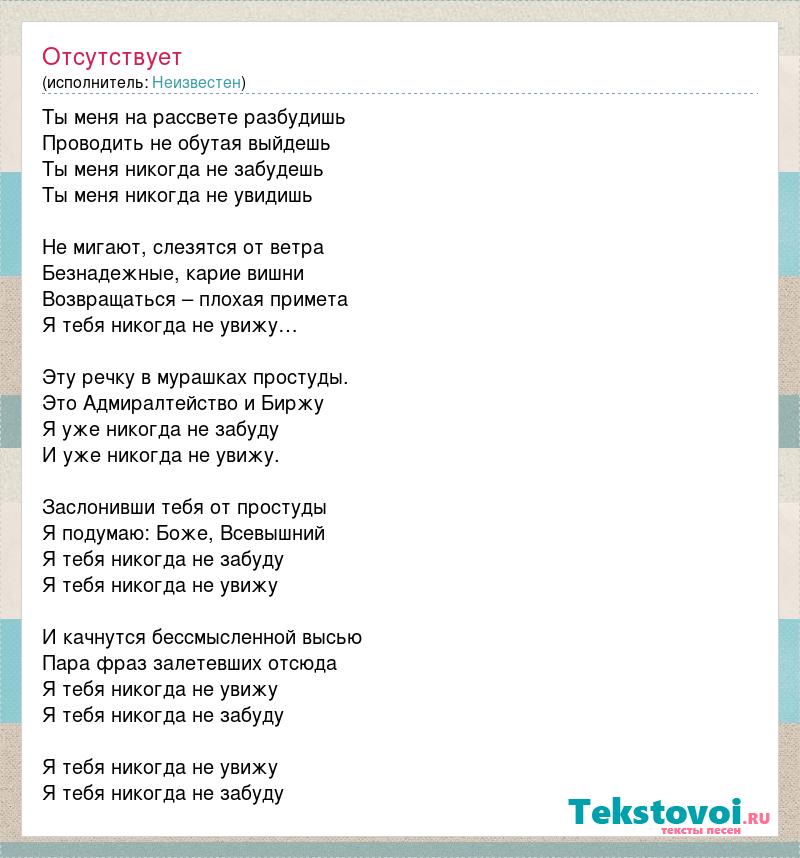 Ты меня на рассвете разбудишь Проводить не обутая выйдешь Ты меня никогда не забудешь Ты меня никогда не увидишь Не мигают, слезятся от ветра Безнадежные, карие вишни Возвращаться – плохая примета Я тебя никогда не увижу… Эту речку в мурашках простуды. Это Адмиралтейство и Биржу Я уже никогда не забуду И уже никогда не увижу. Заслонивши тебя от простуды Я подумаю: Боже, Всевышний Я тебя никогда не забуду Я тебя никогда не увижу И качнутся бессмысленной высью Пара фраз залетевших отсюда Я тебя никогда не увижу Я тебя никогда не забуду Я тебя никогда не увижу Я тебя никогда не забуду
