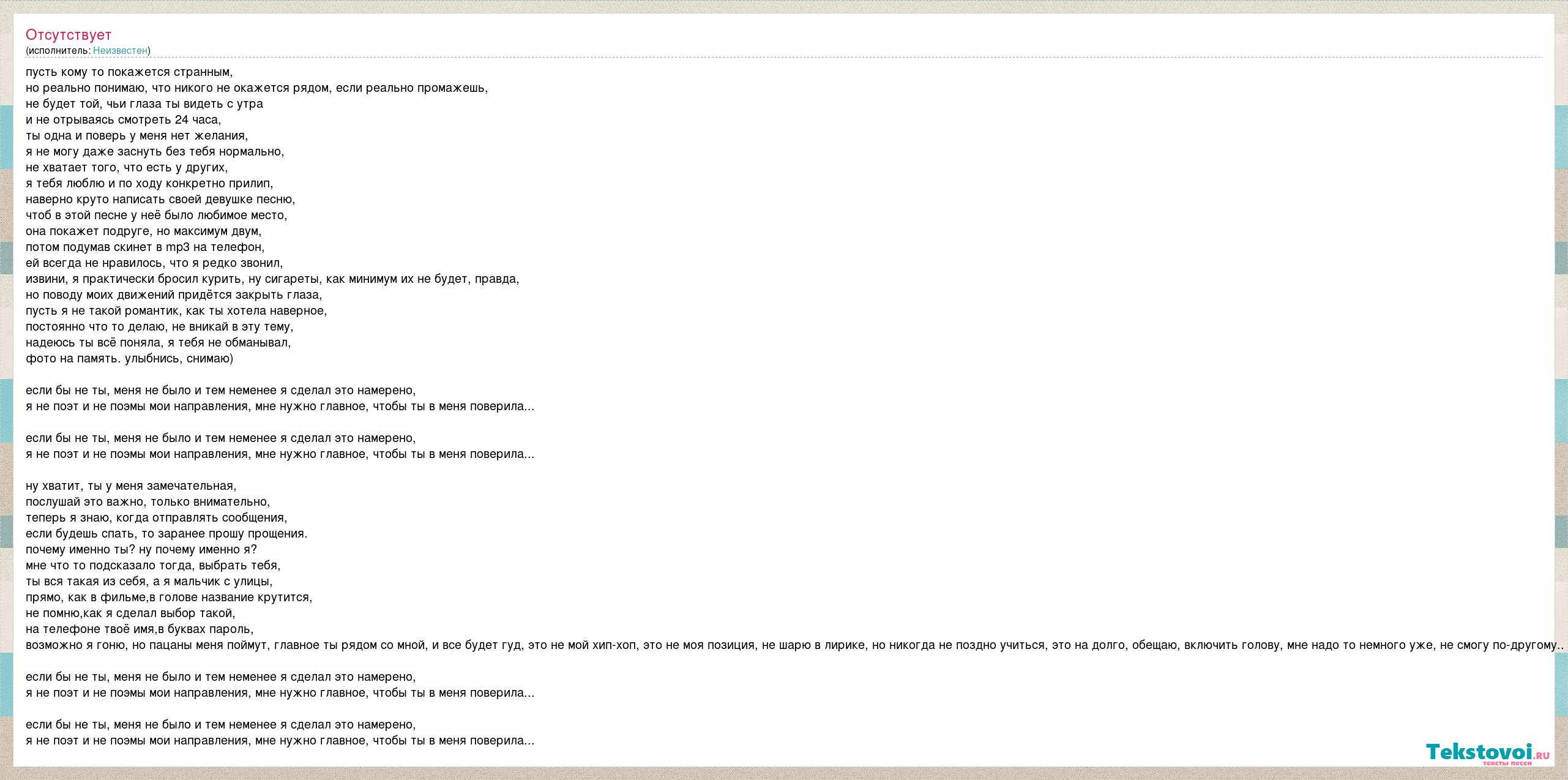 пусть кому то покажется странным, но реально понимаю, что никого не окажется рядом, если реально промажешь, не будет той, чьи глаза ты видеть с утра и не отрываясь смотреть 24 часа, ты одна и поверь у меня нет желания, я не могу даже заснуть без тебя нормально, не хватает того, что есть у других, я тебя люблю и по ходу конкретно прилип, наверно круто написать своей девушке песню, чтоб в этой песне у неё было любимое место, она покажет подруге, но максимум двум, потом подумав скинет в mp3 на телефон, ей всегда не нравилось, что я редко звонил, извини, я практически бросил курить, ну сигареты, как минимум их не будет, правда, но поводу моих движений придётся закрыть глаза, пусть я не такой романтик, как ты хотела наверное, постоянно что то делаю, не вникай в эту тему, надеюсь ты всё поняла, я тебя не обманывал, фото на память. улыбнись, снимаю) если бы не ты, меня не было и тем неменее я сделал это намерено, я не поэт и не поэмы мои направления, мне нужно главное, чтобы ты в меня поверила... если бы не ты, меня не было и тем неменее я сделал это намерено, я не поэт и не поэмы мои направления, мне нужно главное, чтобы ты в меня поверила... ну хватит, ты у меня замечательная, послушай это важно, только внимательно, теперь я знаю, когда отправлять сообщения, если будешь спать, то заранее прошу прощения. почему именно ты? ну почему именно я? мне что то подсказало тогда, выбрать тебя, ты вся такая из себя, а я мальчик с улицы, прямо, как в фильме,в голове название крутится, не помню,как я сделал выбор такой, на телефоне твоё имя,в буквах пароль, возможно я гоню, но пацаны меня поймут, главное ты рядом со мной, и все будет гуд, это не мой хип-хоп, это не моя позиция, не шарю в лирике, но никогда не поздно учиться, это на долго, обещаю, включить голову, мне надо то немного уже, не смогу по-другому.. если бы не ты, меня не было и тем неменее я сделал это намерено, я не поэт и не поэмы мои направления, мне нужно главное, чтобы ты в меня поверила... если бы не ты, меня не было и тем неменее я сделал это намерено, я не поэт и не поэмы мои направления, мне нужно главное, чтобы ты в меня поверила...