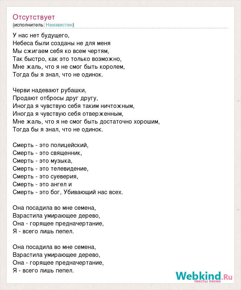 У нас нет будущего, Небеса были созданы не для меня Мы сжигаем себя ко всем чертям, Так быстро, как это только возможно, Мне жаль, что я не смог быть королем, Тогда бы я знал, что не одинок. Черви надевают рубашки, Продают отбросы друг другу, Иногда я чувствую себя таким ничтожным, Иногда я чувствую себя отверженным, Мне жаль, что я не смог быть достаточно хорошим, Тогда бы я знал, что не одинок. Смерть - это полицейский, Смерть - это священник, Смерть - это музыка, Смерть - это телевидение, Смерть - это суеверия, Смерть - это ангел и Смерть - это бог, Убивающий нас всех. Она посадила во мне семена, Взрастила умирающее дерево, Она - горящее предначертание, Я - всего лишь пепел. Она посадила во мне семена, Взрастила умирающее дерево, Она - горящее предначертание, Я - всего лишь пепел.
