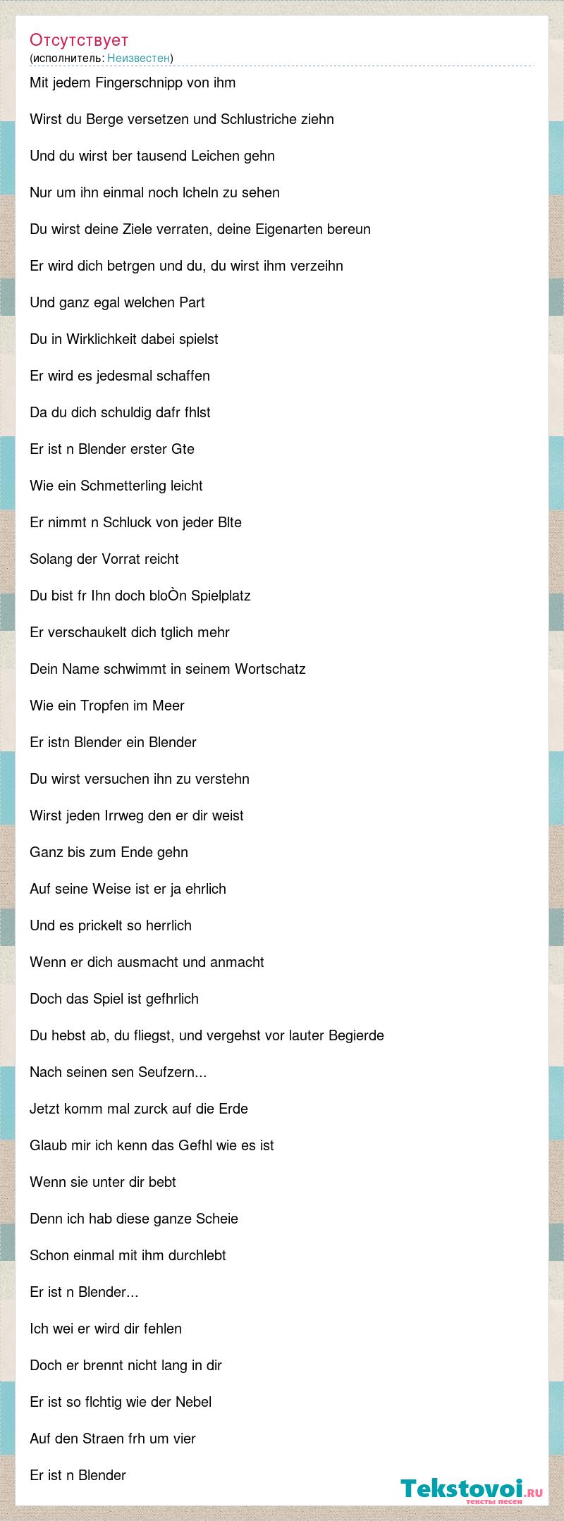 Mit jedem Fingerschnipp von ihm Wirst du Berge versetzen und Schlustriche ziehn Und du wirst ber tausend Leichen gehn Nur um ihn einmal noch lcheln zu sehen Du wirst deine Ziele verraten, deine Eigenarten bereun Er wird dich betrgen und du, du wirst ihm verzeihn Und ganz egal welchen Part Du in Wirklichkeit dabei spielst Er wird es jedesmal schaffen Da du dich schuldig dafr fhlst Er ist n Blender erster Gte Wie ein Schmetterling leicht Er nimmt n Schluck von jeder Blte Solang der Vorrat reicht Du bist fr Ihn doch bloÒn Spielplatz Er verschaukelt dich tglich mehr Dein Name schwimmt in seinem Wortschatz Wie ein Tropfen im Meer Er istn Blender ein Blender Du wirst versuchen ihn zu verstehn Wirst jeden Irrweg den er dir weist Ganz bis zum Ende gehn Auf seine Weise ist er ja ehrlich Und es prickelt so herrlich Wenn er dich ausmacht und anmacht Doch das Spiel ist gefhrlich Du hebst ab, du fliegst, und vergehst vor lauter Begierde Nach seinen sen Seufzern... Jetzt komm mal zurck auf die Erde Glaub mir ich kenn das Gefhl wie es ist Wenn sie unter dir bebt Denn ich hab diese ganze Scheie Schon einmal mit ihm durchlebt Er ist n Blender... Ich wei er wird dir fehlen Doch er brennt nicht lang in dir Er ist so flchtig wie der Nebel Auf den Straen frh um vier Er ist n Blender
