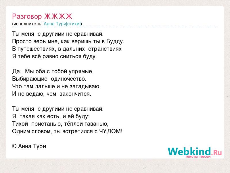 Ты меня с другими не сравнивай. Просто верь мне, как веришь ты в Будду. В путешествиях, в дальних странствиях Я тебе всё равно сниться буду. Да. Мы оба с тобой упрямые, Выбирающие одиночество. Что там дальше и не загадываю, И не ведаю, чем закончится. Ты меня с другими не сравнивай. Я, такая как есть, и ей буду: Тихой пристанью, тёплой гаванью, Одним словом, ты встретился с ЧУДОМ! © Анна Тури
