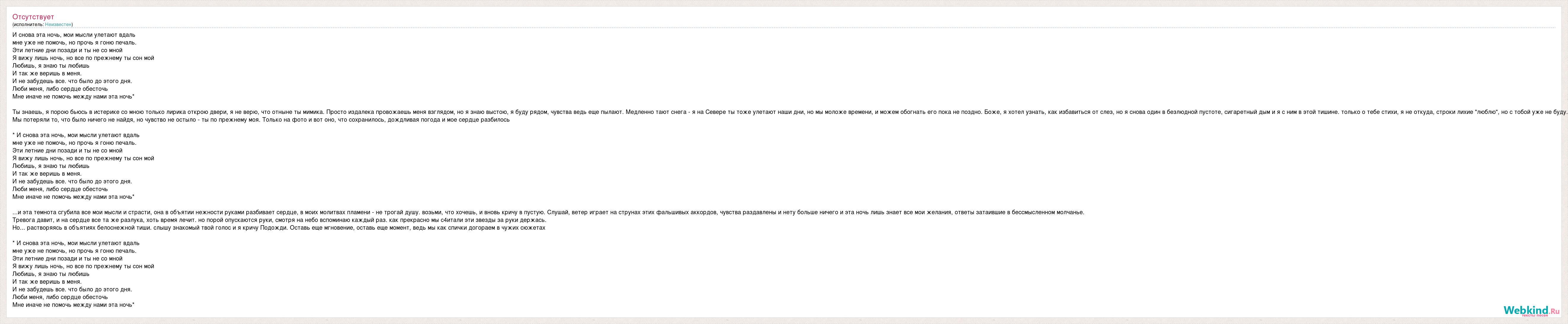 Ты знаешь, я порою бьюсь в истерике со мною только лирика открою двери, я не верю, что отныне ты мимика. Просто издалека провожаешь меня взглядом, но я знаю выстою, я буду рядом, чувства ведь еще пылают. Медленно тают снега - я на Севере ты тоже улетают наши дни, но мы моложе времени, и можем обогнать его пока не поздно. Боже, я хотел узнать, как избавиться от слез, но я снова один в безлюдной пустоте, сигаретный дым и я с ним в этой тишине. только о тебе стихи, я не откуда, строки лихие "люблю", но с тобой уже не буду.