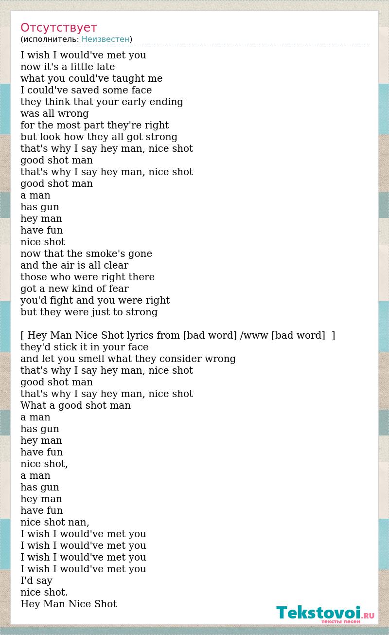 I wish I would've met you now it's a little late what you could've taught me I could've saved some face they think that your early ending was all wrong for the most part they're right but look how they all got strong that's why I say hey man, nice shot good shot man that's why I say hey man, nice shot good shot man a man has gun hey man have fun nice shot now that the smoke's gone and the air is all clear those who were right there got a new kind of fear you'd fight and you were right but they were just to strong [ Hey Man Nice Shot lyrics from [bad word] /www [bad word] ] they'd stick it in your face and let you smell what they consider wrong that's why I say hey man, nice shot good shot man that's why I say hey man, nice shot What a good shot man a man has gun hey man have fun nice shot, a man has gun hey man have fun nice shot nan, I wish I would've met you I wish I would've met you I wish I would've met you I wish I would've met you I'd say nice shot. Hey Man Nice Shot