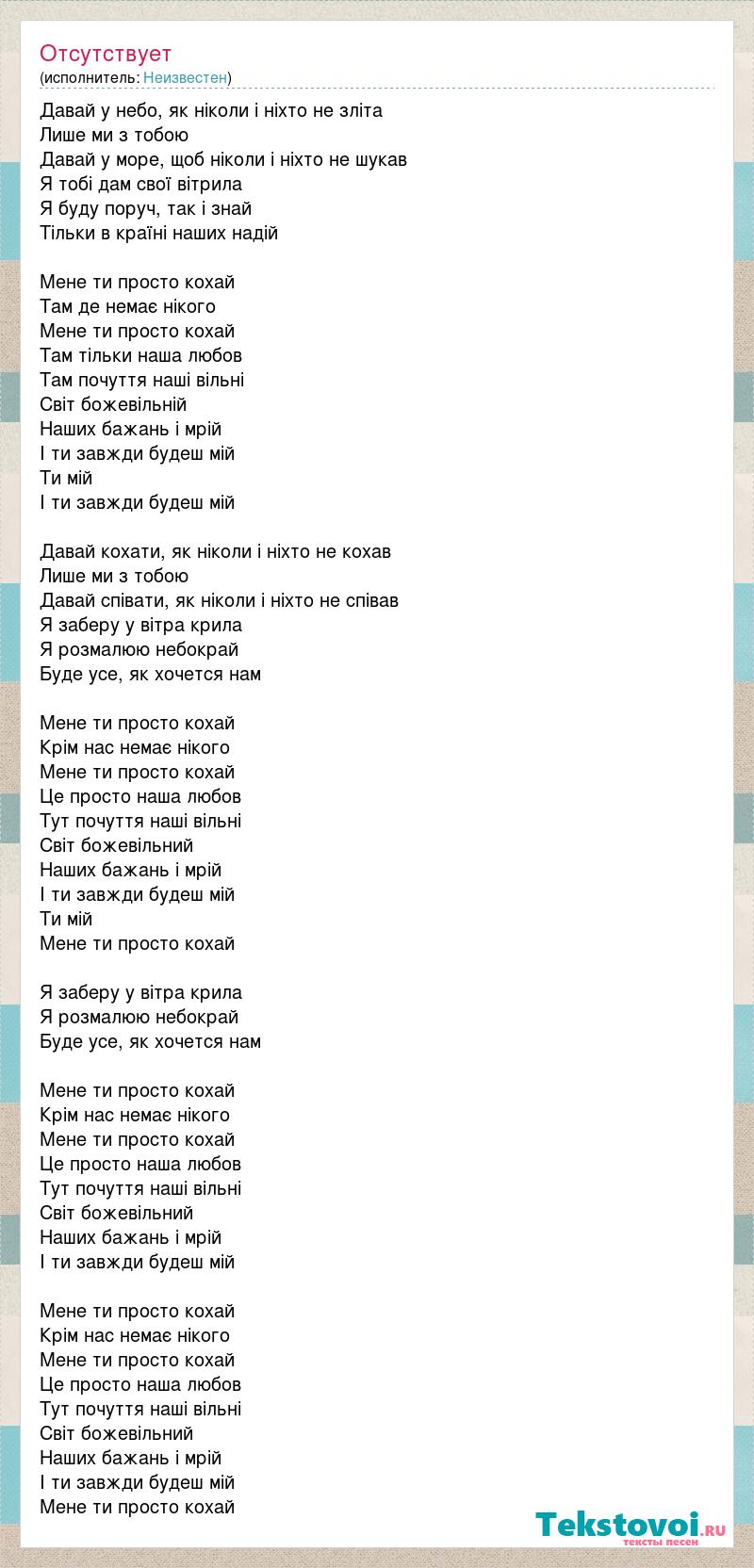 Давай у небо, як ніколи і ніхто не зліта Лише ми з тобою Давай у море, щоб ніколи і ніхто не шукав Я тобі дам свої вітрила Я буду поруч, так і знай Тільки в країні наших надій Мене ти просто кохай Там де немає нікого Мене ти просто кохай Там тільки наша любов Там почуття наші вільні Світ божевільній Наших бажань і мрій І ти завжди будеш мій Ти мій І ти завжди будеш мій Давай кохати, як ніколи і ніхто не кохав Лише ми з тобою Давай співати, як ніколи і ніхто не співав Я заберу у вітра крила Я розмалюю небокрай Буде усе, як хочется нам Мене ти просто кохай Крім нас немає нікого Мене ти просто кохай Це просто наша любов Тут почуття наші вільні Світ божевільний Наших бажань і мрій І ти завжди будеш мій Ти мій Мене ти просто кохай Я заберу у вітра крила Я розмалюю небокрай Буде усе, як хочется нам Мене ти просто кохай Крім нас немає нікого Мене ти просто кохай Це просто наша любов Тут почуття наші вільні Світ божевільний Наших бажань і мрій І ти завжди будеш мій Мене ти просто кохай Крім нас немає нікого Мене ти просто кохай Це просто наша любов Тут почуття наші вільні Світ божевільний Наших бажань і мрій І ти завжди будеш мій Мене ти просто кохай