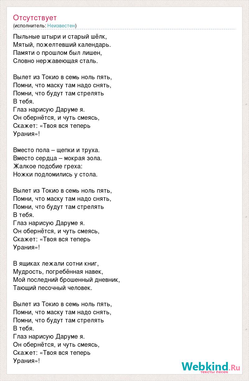 Пыльные штыри и старый шёлк, Мятый, пожелтевший календарь. Памяти о прошлом был лишен, Словно нержавеющая сталь. Вылет из Токио в семь ноль пять, Помни, что маску там надо снять, Помни, что будут там стрелять В тебя. Глаз нарисую Даруме я. Он обернётся, и чуть смеясь, Скажет: «Твоя вся теперь Урания»! Вместо пола – щепки и труха. Вместо сердца – мокрая зола. Жалкое подобие греха: Ножки подломились у стола. Вылет из Токио в семь ноль пять, Помни, что маску там надо снять, Помни, что будут там стрелять В тебя. Глаз нарисую Даруме я. Он обернётся, и чуть смеясь, Скажет: «Твоя вся теперь Урания»! В ящиках лежали сотни книг, Мудрость, погребённая навек, Мой последний брошенный дневник, Тающий песочный человек. Вылет из Токио в семь ноль пять, Помни, что маску там надо снять, Помни, что будут там стрелять В тебя. Глаз нарисую Даруме я. Он обернётся, и чуть смеясь, Скажет: «Твоя вся теперь Урания»!