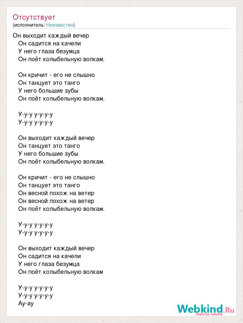 Он выходит каждый вечер Он садится на качели У него глаза безумца Он поёт колыбельную волкам. Он кричит - его не слышно Он танцует это танго У него большие зубы Он поёт колыбельную волкам. У-у-у у-у-у-у У-у-у у-у-у-у Он выходит каждый вечер Он танцует это танго У него большие зубы Он поёт колыбельную волкам. Он кричит - его не слышно Он танцует это танго Он весной похож на ветер Он весной похож на ветер Он поёт колыбельную волкам. У-у-у у-у-у-у У-у-у у-у-у-у Он выходит каждый вечер Он садится на качели У него глаза безумца Он поёт колыбельную волкам У-у-у у-у-у-у У-у-у у-у-у-у Ау-ау