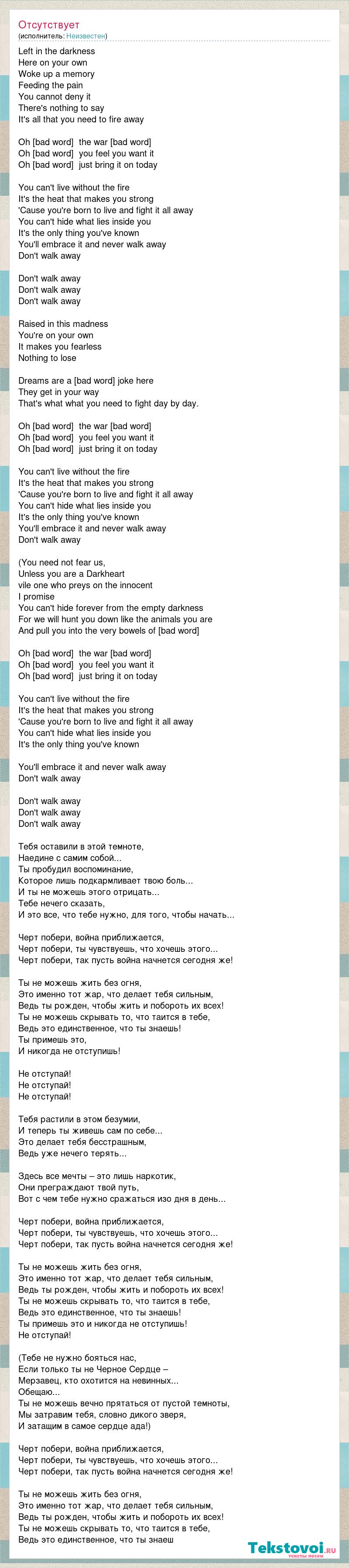 Left in the darkness Here on your own Woke up a memory Feeding the pain You cannot deny it There's nothing to say It's all that you need to fire away Oh [bad word] the war [bad word] Oh [bad word] you feel you want it Oh [bad word] just bring it on today You can't live without the fire It's the heat that makes you strong 'Cause you're born to live and fight it all away You can't hide what lies inside you It's the only thing you've known You'll embrace it and never walk away Don't walk away Don't walk away Don't walk away Don't walk away Raised in this madness You're on your own It makes you fearless Nothing to lose Dreams are a [bad word] joke here They get in your way That's what what you need to fight day by day. Oh [bad word] the war [bad word] Oh [bad word] you feel you want it Oh [bad word] just bring it on today You can't live without the fire It's the heat that makes you strong 'Cause you're born to live and fight it all away You can't hide what lies inside you It's the only thing you've known You'll embrace it and never walk away Don't walk away (You need not fear us, Unless you are a Darkheart vile one who preys on the innocent I promise You can't hide forever from the empty darkness For we will hunt you down like the animals you are And pull you into the very bowels of [bad word] Oh [bad word] the war [bad word] Oh [bad word] you feel you want it Oh [bad word] just bring it on today You can't live without the fire It's the heat that makes you strong 'Cause you're born to live and fight it all away You can't hide what lies inside you It's the only thing you've known You'll embrace it and never walk away Don't walk away Don't walk away Don't walk away Don't walk away Тебя оставили в этой темноте, Наедине с самим собой... Ты пробудил воспоминание, Которое лишь подкармливает твою боль... И ты не можешь этого отрицать... Тебе нечего сказать, И это все, что тебе нужно, для того, чтобы начать... Черт побери, война приближается, Черт побери, ты чувствуешь, что хочешь этого... Черт побери, так пусть война начнется сегодня же! Ты не можешь жить без огня, Это именно тот жар, что делает тебя сильным, Ведь ты рожден, чтобы жить и побороть их всех! Ты не можешь скрывать то, что таится в тебе, Ведь это единственное, что ты знаешь! Ты примешь это, И никогда не отступишь! Не отступай! Не отступай! Не отступай! Тебя растили в этом безумии, И теперь ты живешь сам по себе... Это делает тебя бесстрашным, Ведь уже нечего терять... Здесь все мечты – это лишь наркотик, Они преграждают твой путь, Вот с чем тебе нужно сражаться изо дня в день... Черт побери, война приближается, Черт побери, ты чувствуешь, что хочешь этого... Черт побери, так пусть война начнется сегодня же! Ты не можешь жить без огня, Это именно тот жар, что делает тебя сильным, Ведь ты рожден, чтобы жить и побороть их всех! Ты не можешь скрывать то, что таится в тебе, Ведь это единственное, что ты знаешь! Ты примешь это и никогда не отступишь! Не отступай! (Тебе не нужно бояться нас, Если только ты не Черное Сердце – Мерзавец, кто охотится на невинных... Обещаю... Ты не можешь вечно прятаться от пустой темноты, Мы затравим тебя, словно дикого зверя, И затащим в самое сердце ада!) Черт побери, война приближается, Черт побери, ты чувствуешь, что хочешь этого... Черт побери, так пусть война начнется сегодня же! Ты не можешь жить без огня, Это именно тот жар, что делает тебя сильным, Ведь ты рожден, чтобы жить и побороть их всех! Ты не можешь скрывать то, что таится в тебе, Ведь это единственное, что ты знаеш