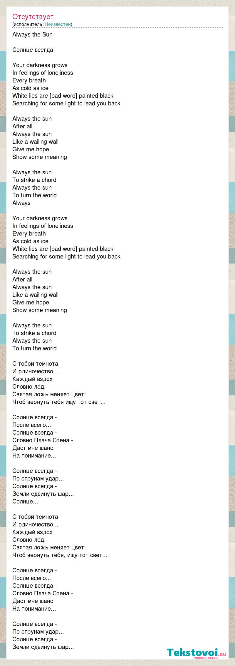 Always the Sun Солнце всегда Your darkness grows In feelings of loneliness Every breath As cold as ice White lies are [bad word] painted black Searching for some light to lead you back Always the sun After all Always the sun Like a wailing wall Give me hope Show some meaning Always the sun To strike a chord Always the sun To turn the world Always Your darkness grows In feelings of loneliness Every breath As cold as ice White lies are [bad word] painted black Searching for some light to lead you back Always the sun After all Always the sun Like a wailing wall Give me hope Show some meaning Always the sun To strike a chord Always the sun To turn the world С тобой темнота И одиночество... Каждый вздох Словно лед. Святая ложь меняет цвет: Чтоб вернуть тебя ищу тот свет... Солнце всегда - После всего... Солнце всегда - Словно Плача Стена - Даст мне шанс На понимание... Солнце всегда - По струнам удар... Солнце всегда - Земли сдвинуть шар... Солнце... С тобой темнота И одиночество... Каждый вздох Словно лед. Святая ложь меняет цвет: Чтоб вернуть тебя, ищу тот свет... Солнце всегда - После всего... Солнце всегда - Словно Плача Стена - Даст мне шанс На понимание... Солнце всегда - По струнам удар... Солнце всегда - Земли сдвинуть шар...
